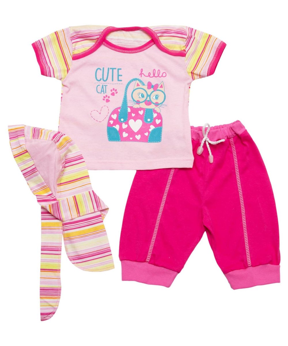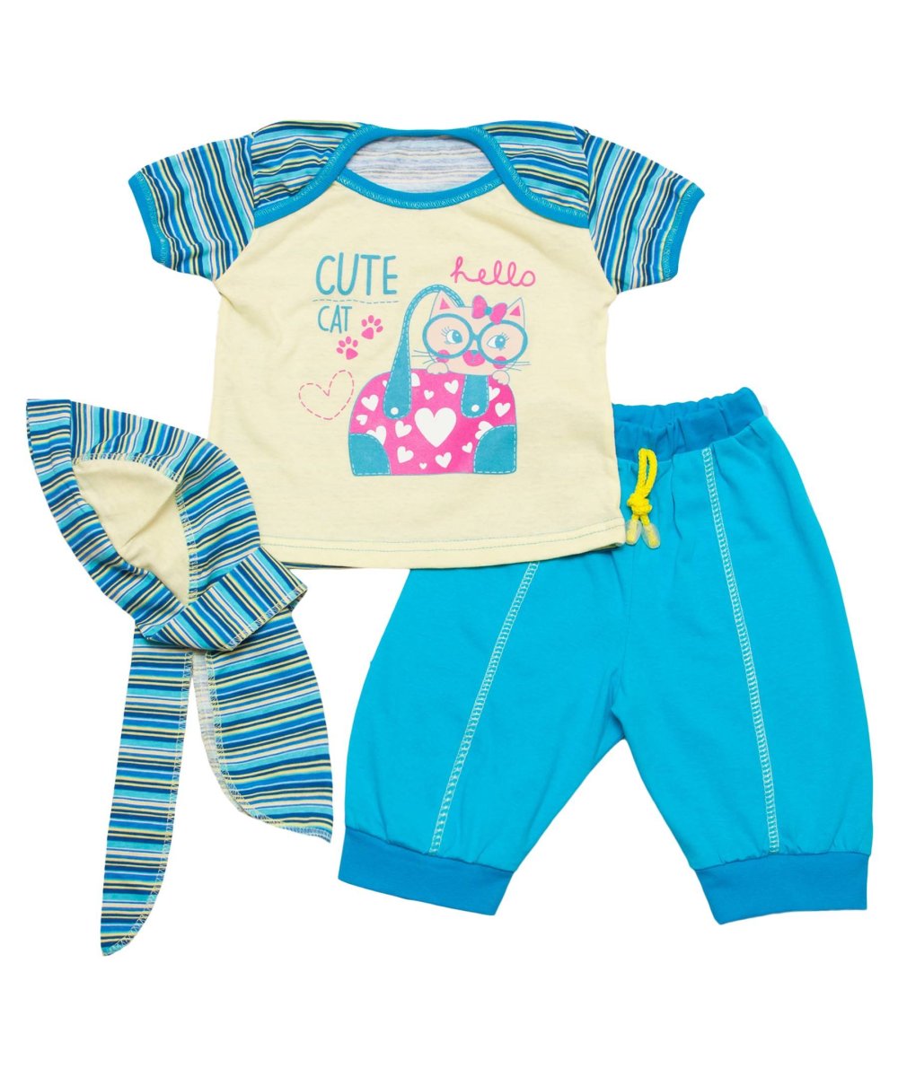 Універсальний комплект для дівчинки виготовлений з бавовняного полотна – кулір. Комплект "трійка" Обов'язково знадобиться вашій дитині цього літа. В комплект входить: футболка, бриджі та бандана-африканка. Футболка комбінована з двох полотен: однотонного та набивного. Горловина виконана у вигляді "човника". По переду наймиліше фарбування. Бриджі однотонні. По поясу – широка гума, шнурок – обманка. Внизу штанців - манжети. Декором є акуратне відстрочення розкладником попереду. Бандана-африканка, яка зав'язується позаду. Плюсом у ній є те, що ззаду покривається шия дитини від сонячних променів. Приємних покупок!