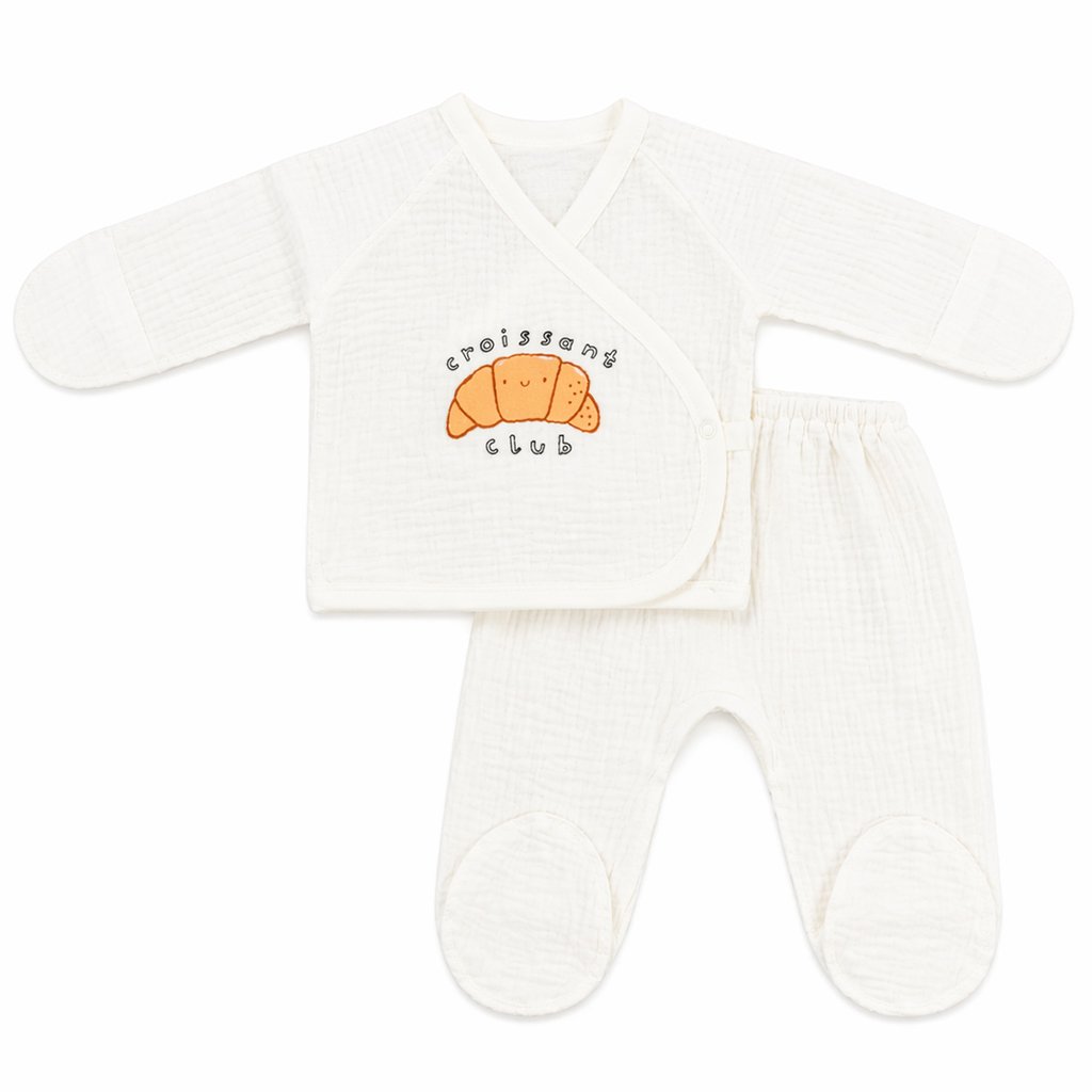 Комплект для найменших це незамінна річ у перші місяці життя малюка. Комплект молочного кольору складається із льолі та повзунів, виготовлені з бавовняної тканини муслін. Сорочечка із закритими ручками, застібається на запах, попереду розташований милий малюнок круасанчика. Повзуни за кроєм ідеально підходять під памперс, м'яка резинка не давитиме на животик дитини. Одяг з мусліну чудово підходить у літню спеку. Залишилося підібрати ще бавовняну шапочку, яку Ви також можете купити в нашому інтернет-магазині, та повноцінний образ для малюка зібраний.