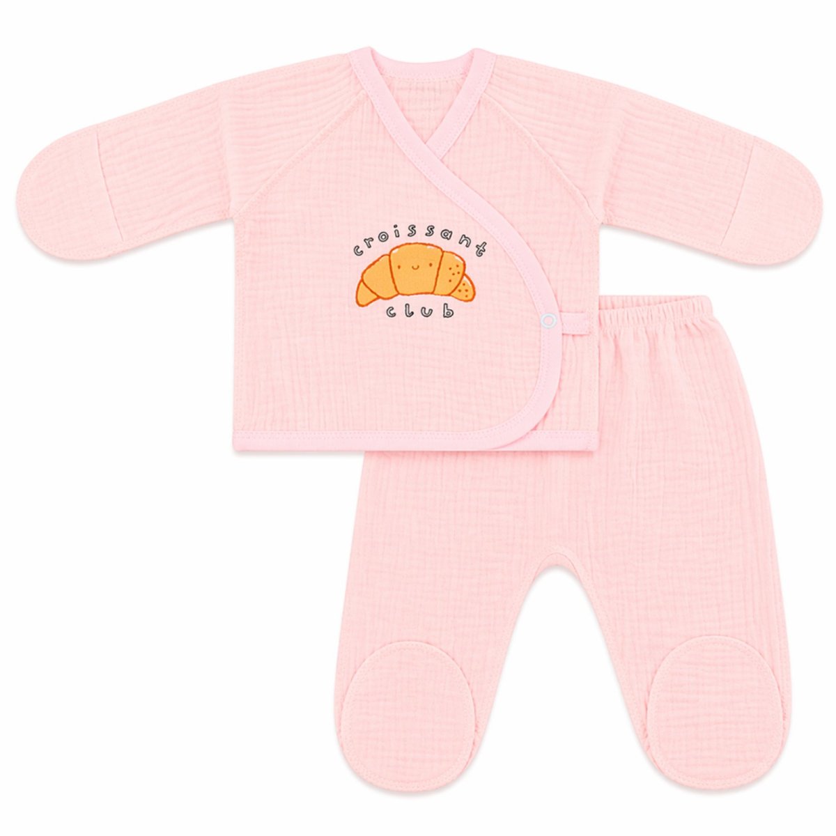Комплект для найменших це незамінна річ у перші місяці життя малюка. Комплект роожевого кольору складається із льолі та повзунів, виготовлені з бавовняної тканини муслін. Сорочечка із закритими ручками, застібається на запах, попереду розташований милий малюнок круасанчика. Повзуни за кроєм ідеально підходять під памперс, м'яка резинка не давитиме на животик дитини. Одяг з мусліну чудово підходить у літню спеку. Залишилося підібрати ще бавовняну шапочку, яку Ви також можете купити в нашому інтернет-магазині, та повноцінний образ для малюка зібраний.
