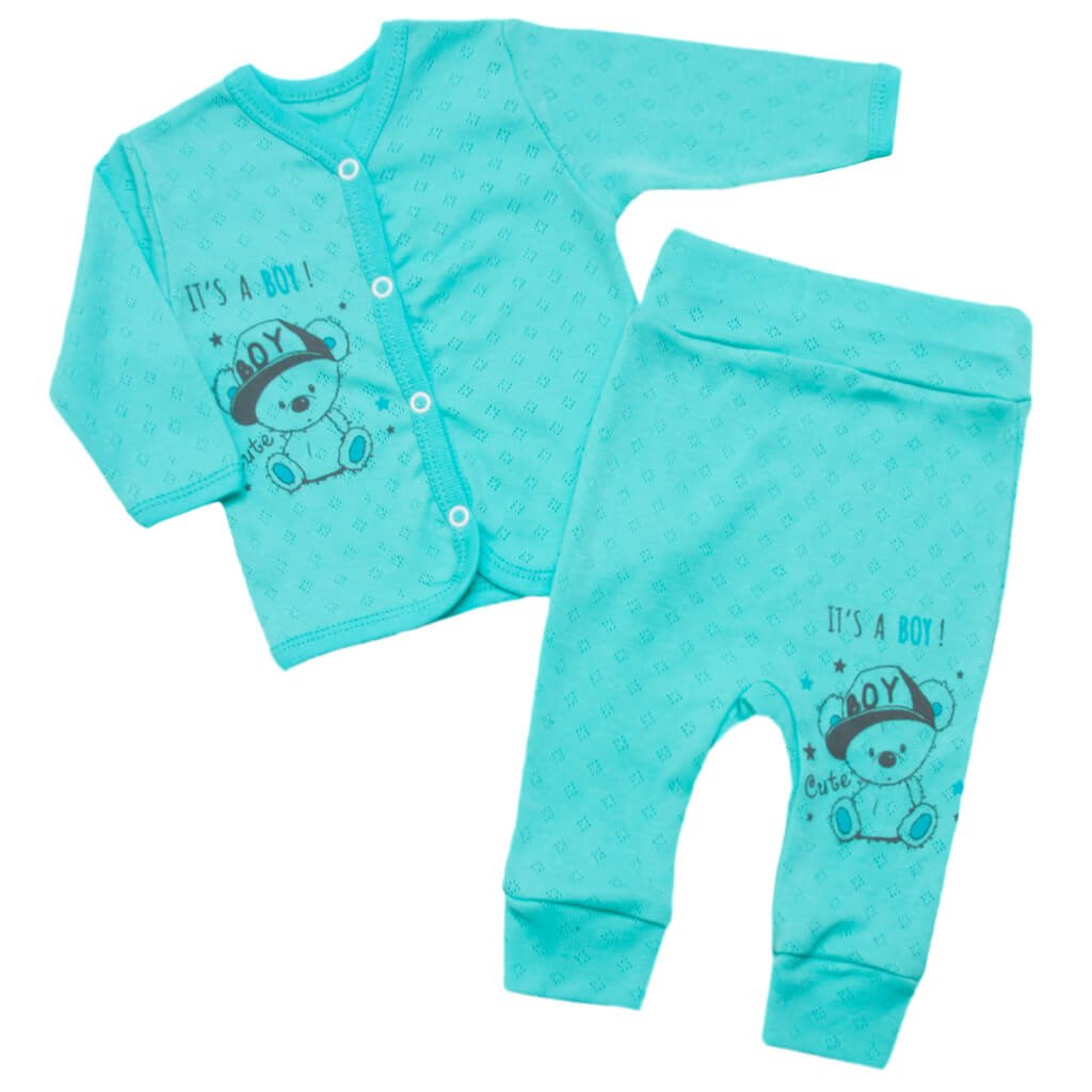Кожному малюку потрібна якісний і безпечний одяг. Саме такі вироби Ви зможете знайти в нашому інтернет-магазині «Арлекин». Неймовірна новинка вже готова до замовлення на нашому сайті. Представлений комплект для хлопчика м'ятного кольору, виготовлений з якісної рібани жаккард. Таке полотно прекрасно підходить для виготовлення одягу для самих маленьких, так як воно гіпоалергенне і досить практичне. Комплект складається з кофтинки з довгим рукавом, яка застібається на кнопочки, і штанців на хорошій резинці. І кофточку, і штанці прикрашає цікаве фарбування.
