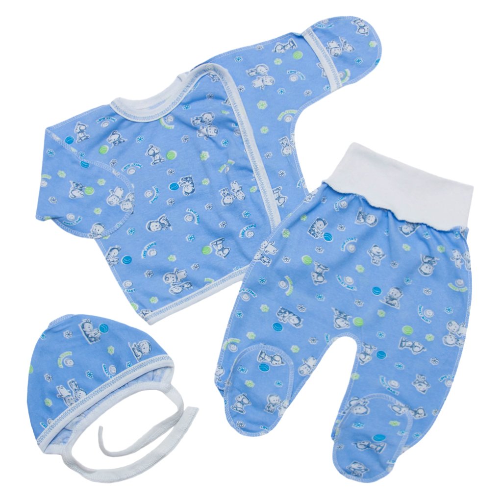 Комплект для хлопчика виготовлений з бавовняного полотна - кулір. Данний комплект, синього кольору принт дітки, складається з трьох речей: сорочечка, єврики і чепчик. Сорочечка - на запах, застібається на кнопки на плечиках. Єврики зі стоячою ніжкою, на поясі - широкий і еластичний манжет, який не буде здавлювати і натирати животик малюка. Чепчик - на зав'язочках. Всі шви в комплекті виконані навиворіт. Замовте такий комплект для свого малюка в нашому інтернет-магазині і Ви неодмінно залишитеся задоволені якістю і зовнішнім виглядом. Приємних покупок!