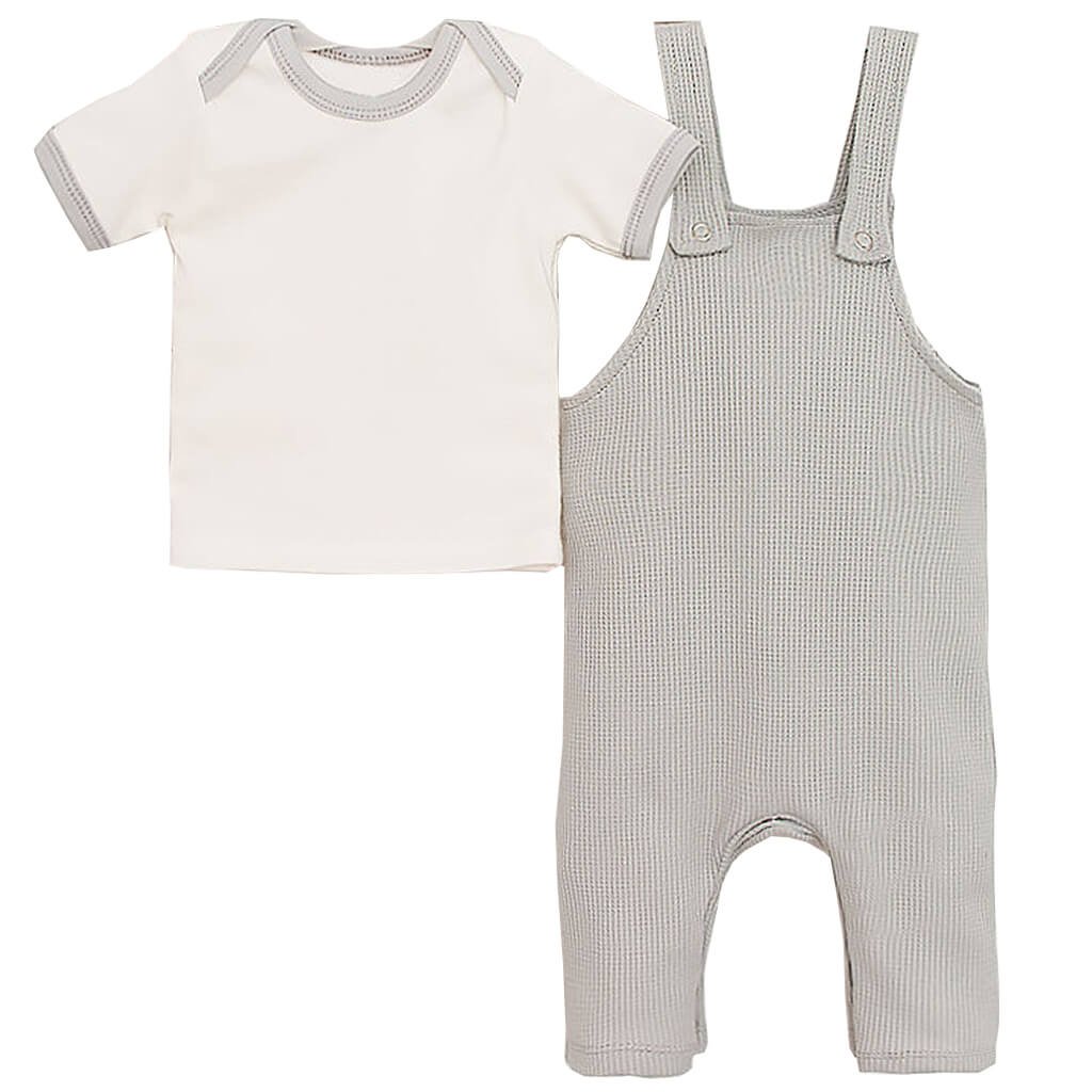 Комплект для малюків складається зі зручної футболочки білого кольору та пісочника сірого кольору. Вироби представленого комплекту виготовлені з високоякісного інтерлоку, натурального і гіпоалергенного полотна. Горловина футболки виконана у вигляді "човника", а краї оброблені красивою бейкою. Пісочник має широкі лямки, які застібаються на кнопочки. Також кнопочки присутні і між ніжок, що значно полегшує процес одягання і переодягання дитини. Такий стильний і комфортний комплект ідеально підходить для повсякденного носіння та активних ігор на свіжому повітрі.