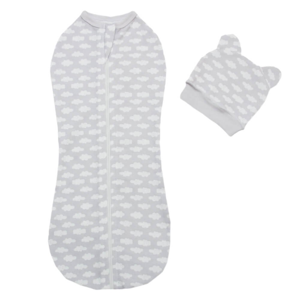 Пелюшка-кокон для новонародженого пошита з високоякісного бавовняного полотна - інтерлоку сірого кольору. М'який і неймовірно ніжний матеріал подарує максимальний затишок та відчуття захищеності Вашому малюку. Представлена модель дитячого кокона застібається на блискавку. Горловина оброблена бейкою. По всьому полотну пелюшки-кокона присутні різні малюнки і візерунки хмаринок, які відмінно доповнюють дизайн. У комплекті з коконом для новонародженого також йде шапочка, виготовлена з такого ж полотна. Однотонна шапочка прикрашена милими вушками.