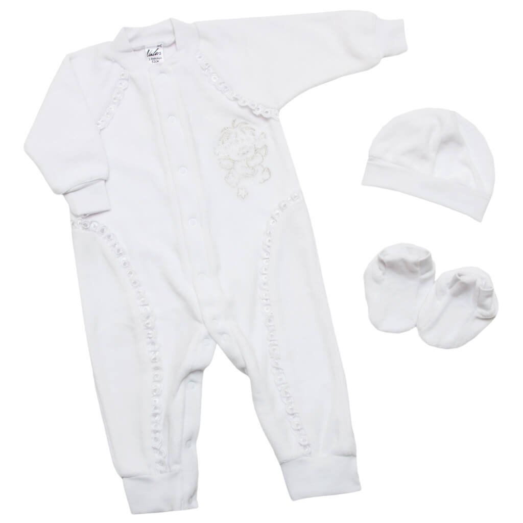 Виписка з пологового будинку - дуже важлива подія у житті кожного малюка, і до неї потрібно ретельно підготуватися. Комплект для найменших складається з чоловічка, шапочки та пінеток. Усі складові комплекту пошиті з м'якого і неймовірно приємного на дотик полотна - велюру. Такий матеріал з ніжністю огорне теплом і комфортом Вашу дитину. Комбінезон-чоловічок прикрашений милими ажурними вставками та невеликою нашивкою спереду. На шапочці є широка м'яка резинка, яка добре закріпить виріб на малюку. Поданий комплект підійде і для хлопчика, і для дівчинки.