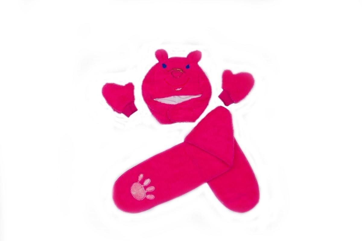 Цей комплект саме те, що вам потрібно на холодний сезон. В негоду завжди стануть в нагоді теплі аксесуари для діток. У комплект входить три вироби: шапочка, рукавиці, шарфик. Головка, ручки, а також шийка вашого малюка буде завжди в теплі, адже комплект зроблений з теплого полотна як фліс. Він підійде як для хлопчика, так і для дівчинки. Шапочка йде на липучці, по верху виробу присутнє зображення «Ведмідь», шапочка має такий декор, як вушка. Ми піклуємося про ваших діток, робимо все можливе, що б вони не мерзли.