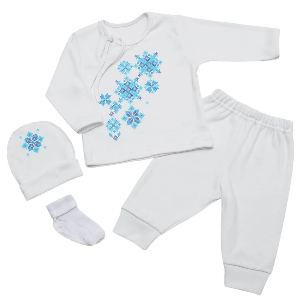 Нова модель комплекту для малюків складається з кофтинки, штанців, шапочки та шкарпеток. Кофтинка, штанці та шапочка пошиті з високоякісного трикотажного матеріалу - інтерлоку. Таке полотно повністю складається з гіпоалергенної бавовни, яка абсолютно безпечна для шкіри дитини. Комплект виконаний у білому кольорі, а кофтинка і шапочка прикрашені неймовірно красивими блакитними візерунками. Штанці на еластичній резинці добре фіксуються на малюку. Шкарпетки дуже м'які і приємні на дотик, тому в них Вашій дитинці буде максимально комфортно.