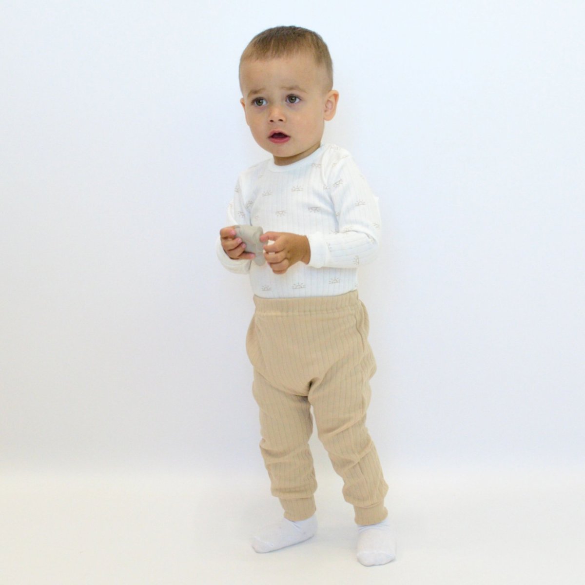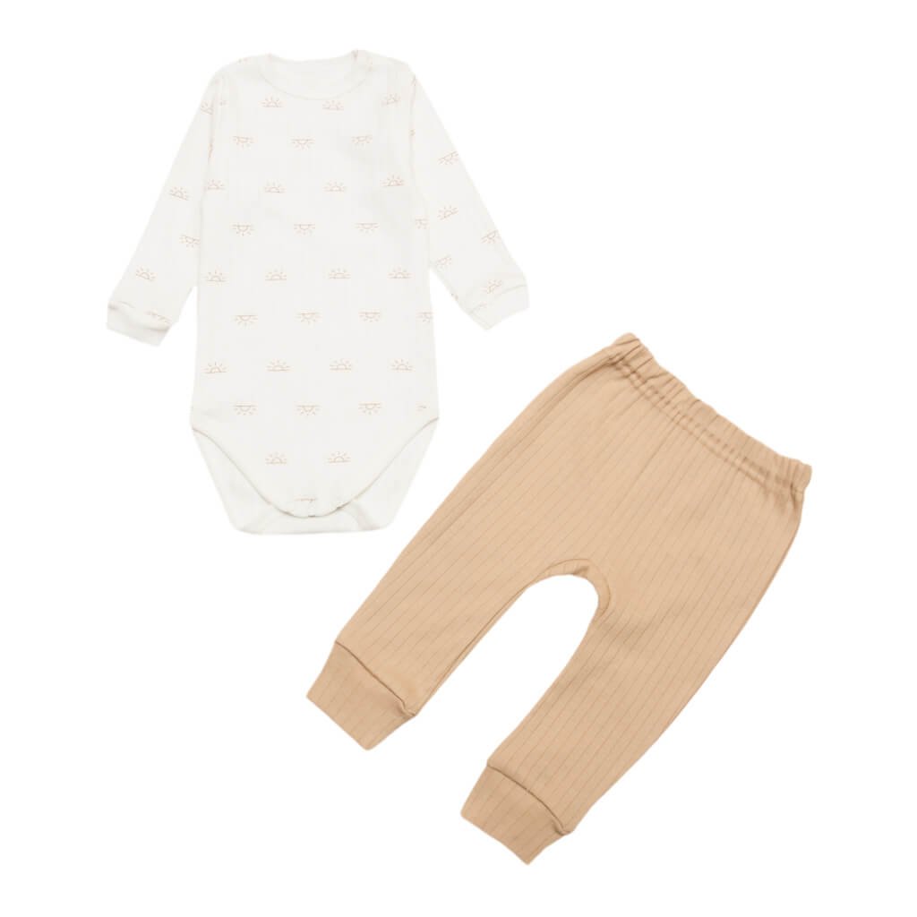 Іноді найпростіше - і є найкраще. Комплект з м'якого інтерлоку рапорт поєднує в собі все, що потрібно малюкові на кожен день: комфорт, зручність і затишок. Боді з довгими рукавами молочного кольору прикрашене ненав'язливим принтом сонечок і продумане до дрібниць - кнопочки біля горловини полегшують одягання, а застібки між ніжок прискорюють зміну підгузника. Однотонні бежеві штанці на м'якій резинці не здавлюють животик і підходять під будь-який образ. В асортименті представлено кілька кольорів, що дозволяє легко підібрати варіант на смак і настрій.