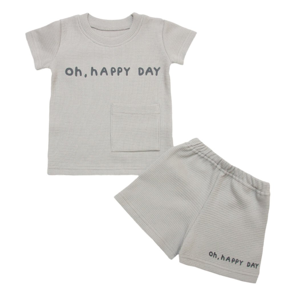 Легкість і комфорт - головні якості дитячого одягу, адже малюки люблять свободу рухів і активні ігри. Цей стильний комплект сірого кольору з написом Oh, happy day з футболки і шортів виконаний з м'якого полотна інтерлок вафелька, яке приємно прилягає до тіла, добре пропускає повітря і не викликає подразнення. Завдяки особливій структурі тканини комплект має оригінальний вигляд і додає образу затишку. Футболка з короткими рукавами має вільний крій, що робить її зручною для повсякденного носіння. Маленька накладна кишенька додає стильний акцент. Шорти з м'яким еластичним поясом надійно сидять на талії, не здавлюючи животик. Вони не сковують рухів і чудово підходять для прогулянок, ігор на свіжому повітрі або відпочинку вдома.