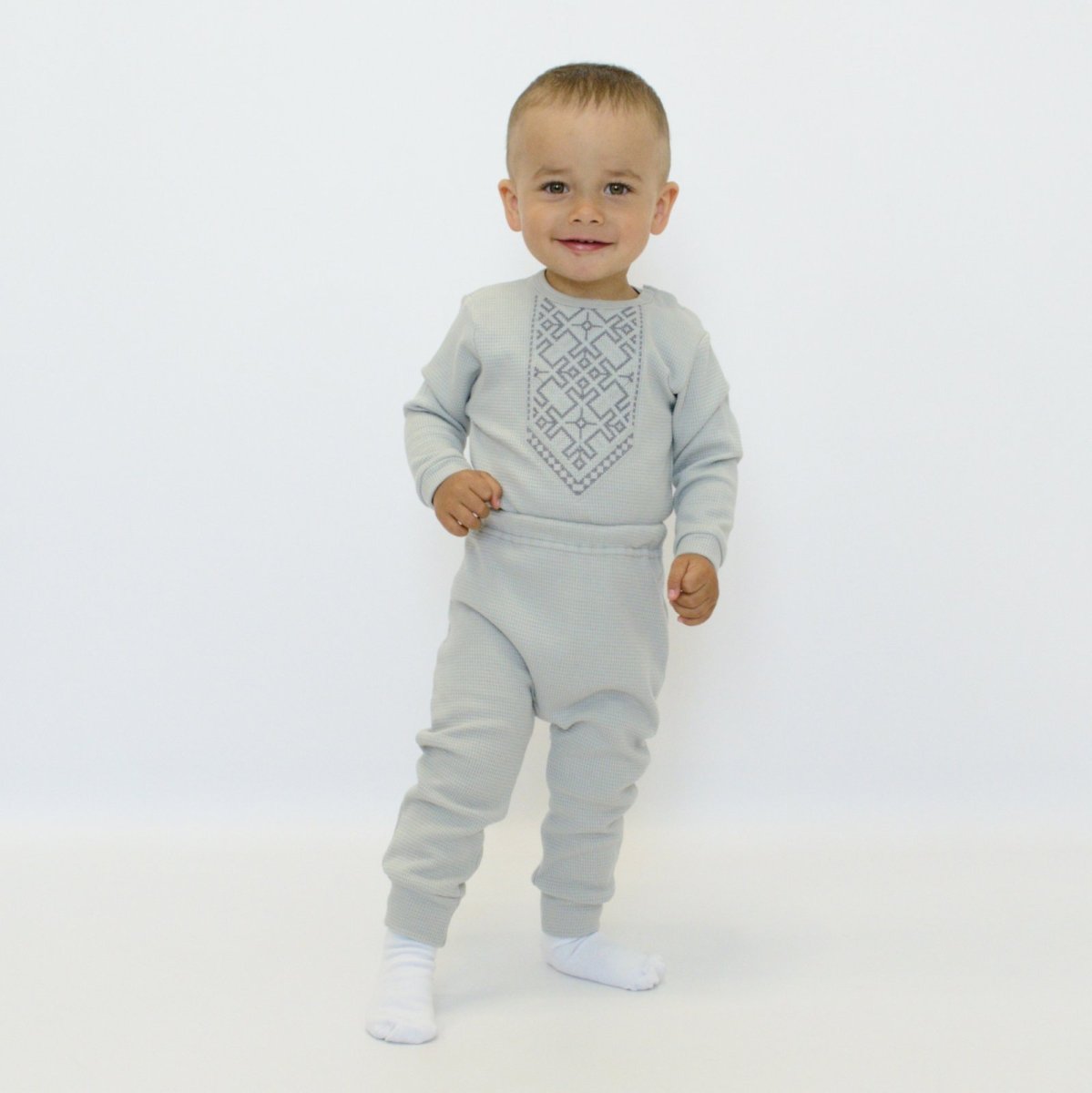Кожна деталь цього ніжного комплекту сірого кольору немов створена з турботою і теплом для найменших. У його складі - зручний боді та м'які штанці з інтерлоку вафелька, що ідеально підходить для чутливої шкіри новонароджених. На грудях боді розташована вишивка в етнічному стилі, що надає образу особливої урочистості. Кнопки в нижній частині забезпечують комфортну зміну підгузника, а штани з м'яким поясом не здавлюють животик і не заважають рухам малюка. Такий комплект відмінно підійде як для щоденного носіння, так і для особливих подій.
