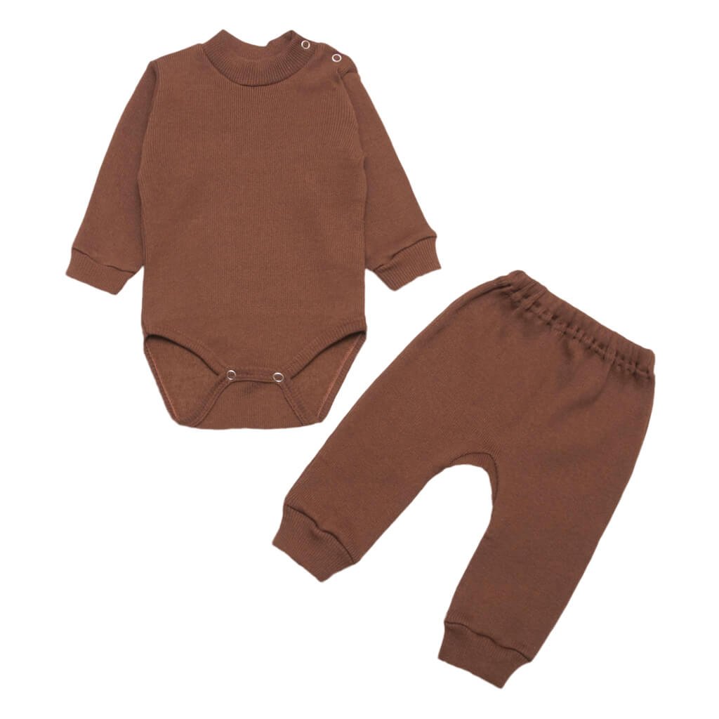 Нова модель дитячого комплекту коричневого кольору стане чудовим вибором для холодного періоду. Комплект складається з боді-гольфу і штанців, які пошиті з високоякісного полотна рубчик начісування. Завдяки особливостям матеріалу, комплект надійно захищає від холоду, залишаючись при цьому м'яким і приємним на дотик. Комплект виконаний в універсальному дизайні та нейтральних тонах, що дає змогу носити його як дівчаткам, так і хлопчикам. М'які манжети на рукавах і штанинах гарантують щільне прилягання до тіла, запобігаючи проникненню холодного повітря. Зручні застібки на боді-гольфі спрощують процес одягання.
