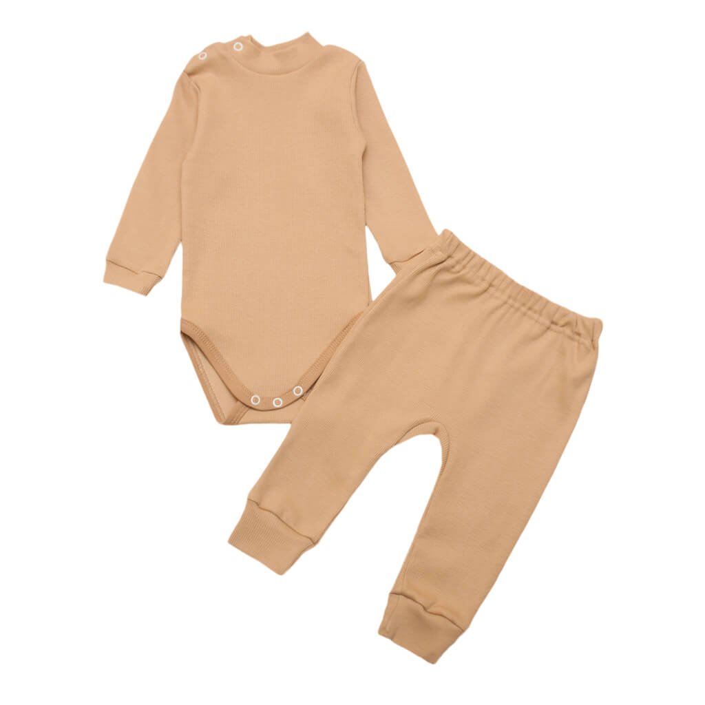 Натхненний затишком і простотою - цей дитячий комплект поєднує в собі комфорт і практичність, які так важливі в одязі для малюків. Він виконаний з м'якого полотна рубчик бежевого кольору, відомого своєю еластичністю та приємною фактурою. Комплект включає однотонний боді-гольф з горловиною-стійкою, яка надійно захищає шию від вітру, і зручні штанці на м'якій резинці. Боді оснащений кнопками внизу і біля горловини для швидкого переодягання. Такий набір підійде як для дому, так і для прогулянок, а різноманітність кольорів допоможе вибрати варіант на будь-який смак.