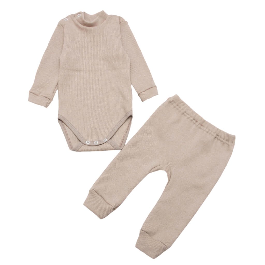 Вашій увазі представлений ідеальним вибір для малюків на осінньо-зимовий період. Комплект боді та штанців виконаний з високоякісного полотна рубчик начісування бежевого кольору. Тканина забезпечує додаткове тепло і комфорт, створюючи приємні відчуття для ніжної дитячої шкіри. Боді виконано з горловиною-стійкою і оснащено зручними кнопками на плічках і внизу, що полегшує процес переодягання і зміни підгузків. Манжети на рукавах додають зручності та запобігають задиранню тканини, зберігаючи тепло. Штанці на еластичній гумці з манжетами забезпечують ідеальну посадку і комфортне прилягання, не сковуючи рухів дитини.