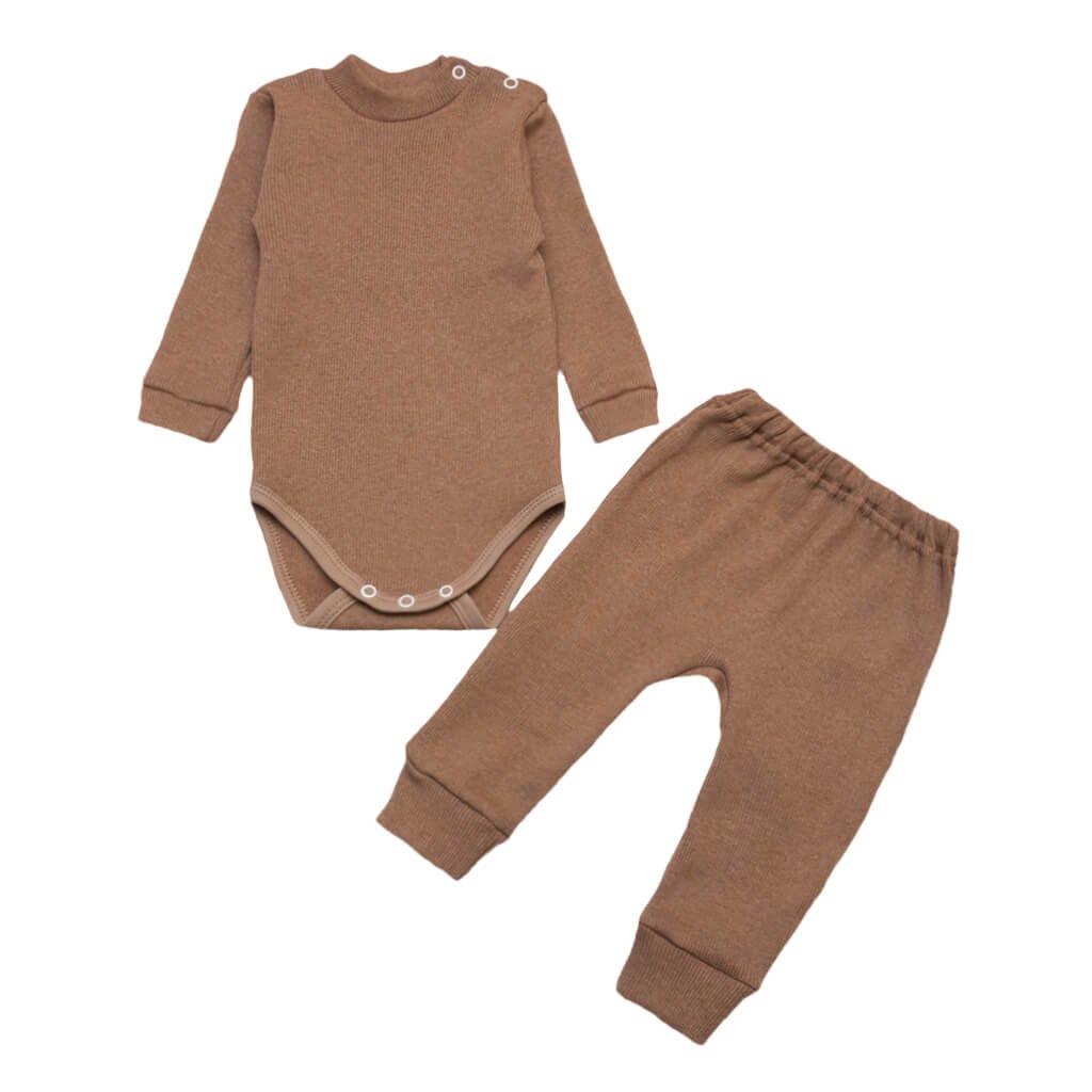 Вашій увазі представлений ідеальним вибір для малюків на осінньо-зимовий період. Комплект боді та штанців виконаний з високоякісного полотна рубчик начісування коричневого кольору. Тканина забезпечує додаткове тепло і комфорт, створюючи приємні відчуття для ніжної дитячої шкіри. Боді виконано з горловиною-стійкою і оснащено зручними кнопками на плічках і внизу, що полегшує процес переодягання і зміни підгузків. Манжети на рукавах додають зручності та запобігають задиранню тканини, зберігаючи тепло. Штанці на еластичній гумці з манжетами забезпечують ідеальну посадку і комфортне прилягання, не сковуючи рухів дитини.