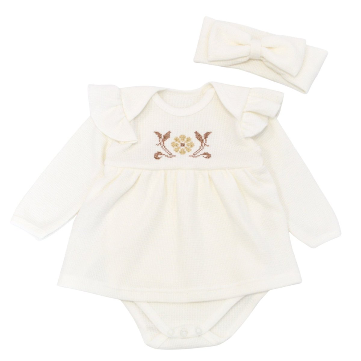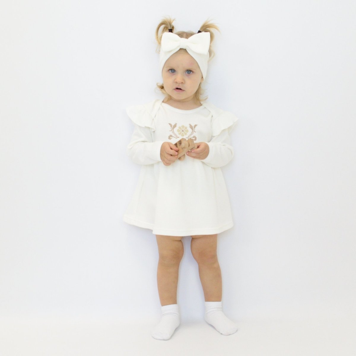 Цей чарівний комплект молочного кольору для дівчаток поєднує в собі ніжність, зручність і ретельно продумані деталі. Він виготовлений з м'якого полотна інтерлок-вафелька - приємного на дотик, добре пропускає повітря і ідеально підходить для чутливої шкіри малюків. Боді зі спідничкою виконаний у формі «човник» по горловині, що полегшує переодягання. Легкі крильця на плечах додають повітряності, а на передній частині також присутня акуратна вишивка. Модель застібається знизу на кнопки - це зручно як для батьків, так і для маленької модниці. У комплект входить еластична пов'язка з великим бантом - стильне і практичне доповнення, що завершує образ.