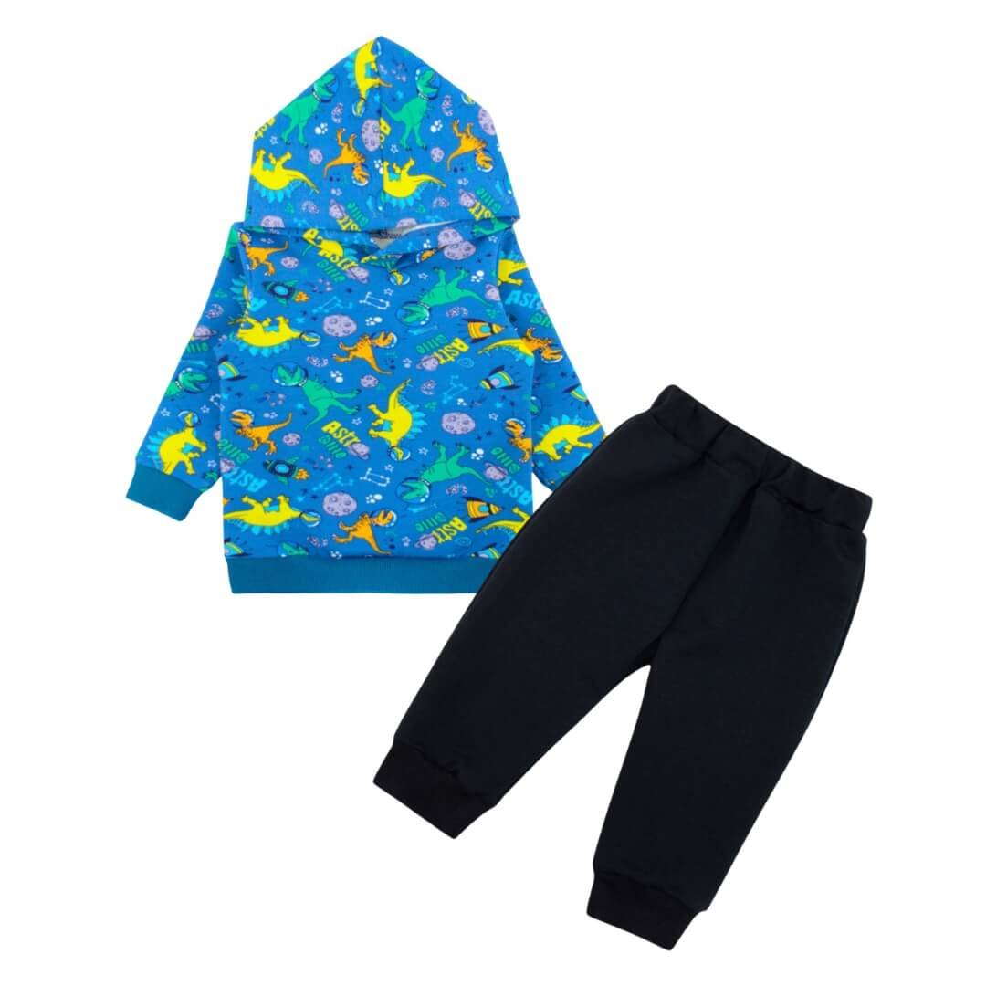 Теплі прогулянки та затишні домашні вечори стають ще приємнішими з зручним одягом. Комплект бірюзового кольору з принтом динозаврів з м'якої двонитки складається з кофти з капюшоном і комфортних штанців - практичне рішення для активних діточок. Капюшон захищає від вітряної погоди, а еластичні манжети по краях забезпечують надійну посадку і зберігають тепло. Штани забезпечують повну свободу рухів, тому дитині зручно грати та активно проводити час на прогулянках. В асортименті є варіанти кольорів для дівчаток і хлопчиків, що дозволяє легко підібрати відповідний стиль для кожного. Відмінний вибір для прохолодної погоди та стильного повсякденного образу.