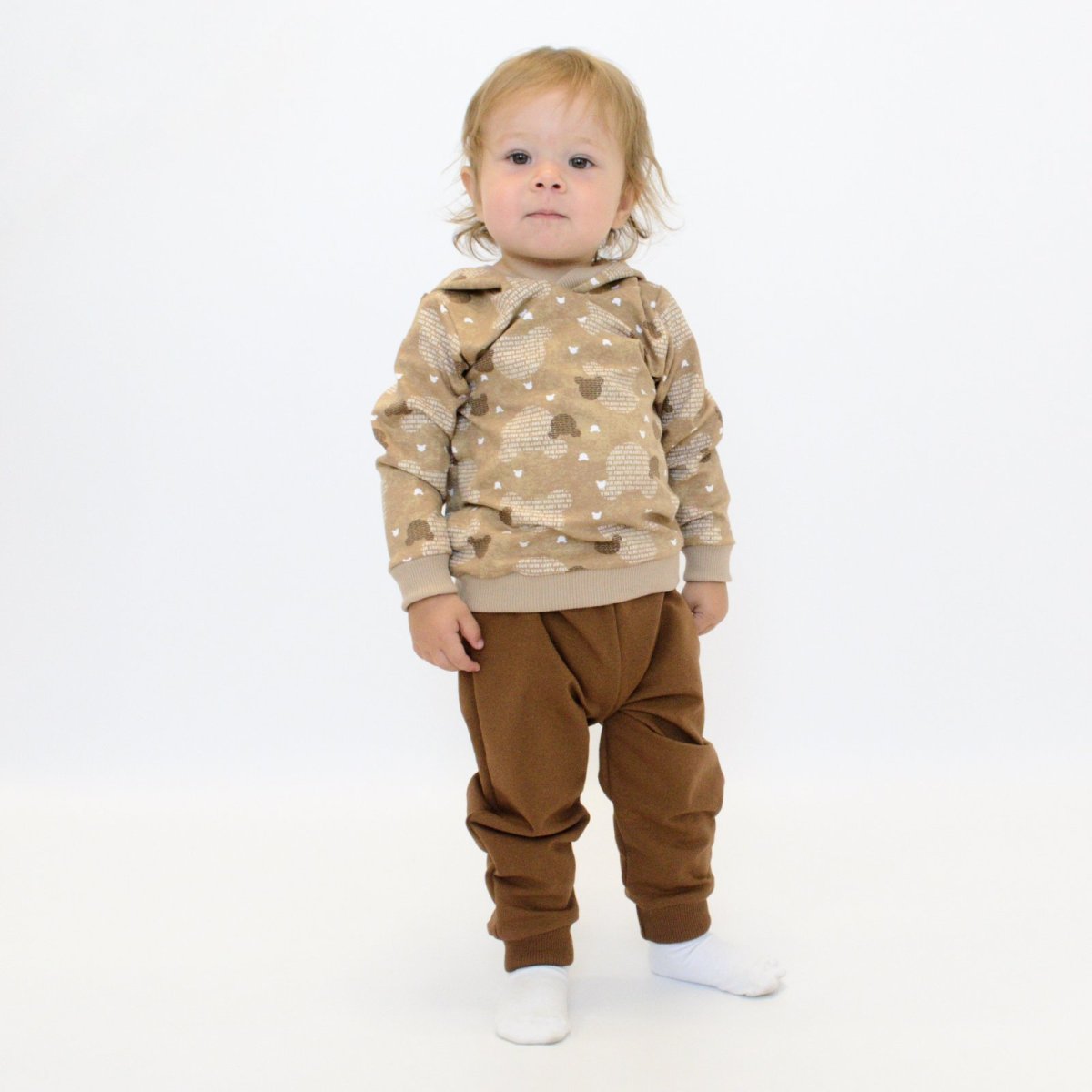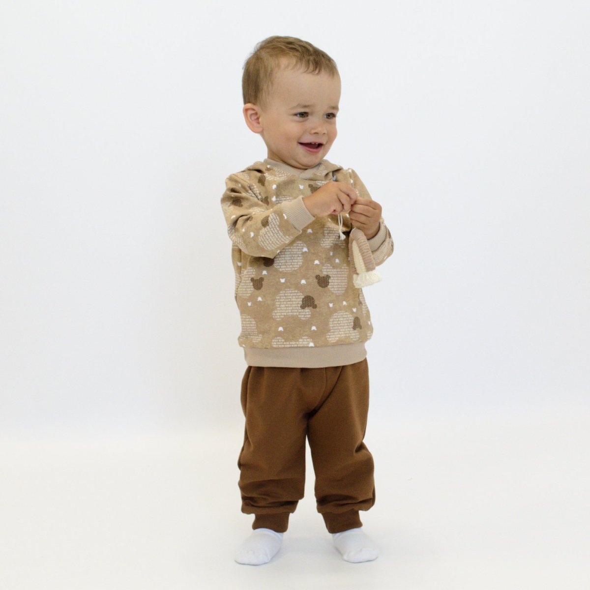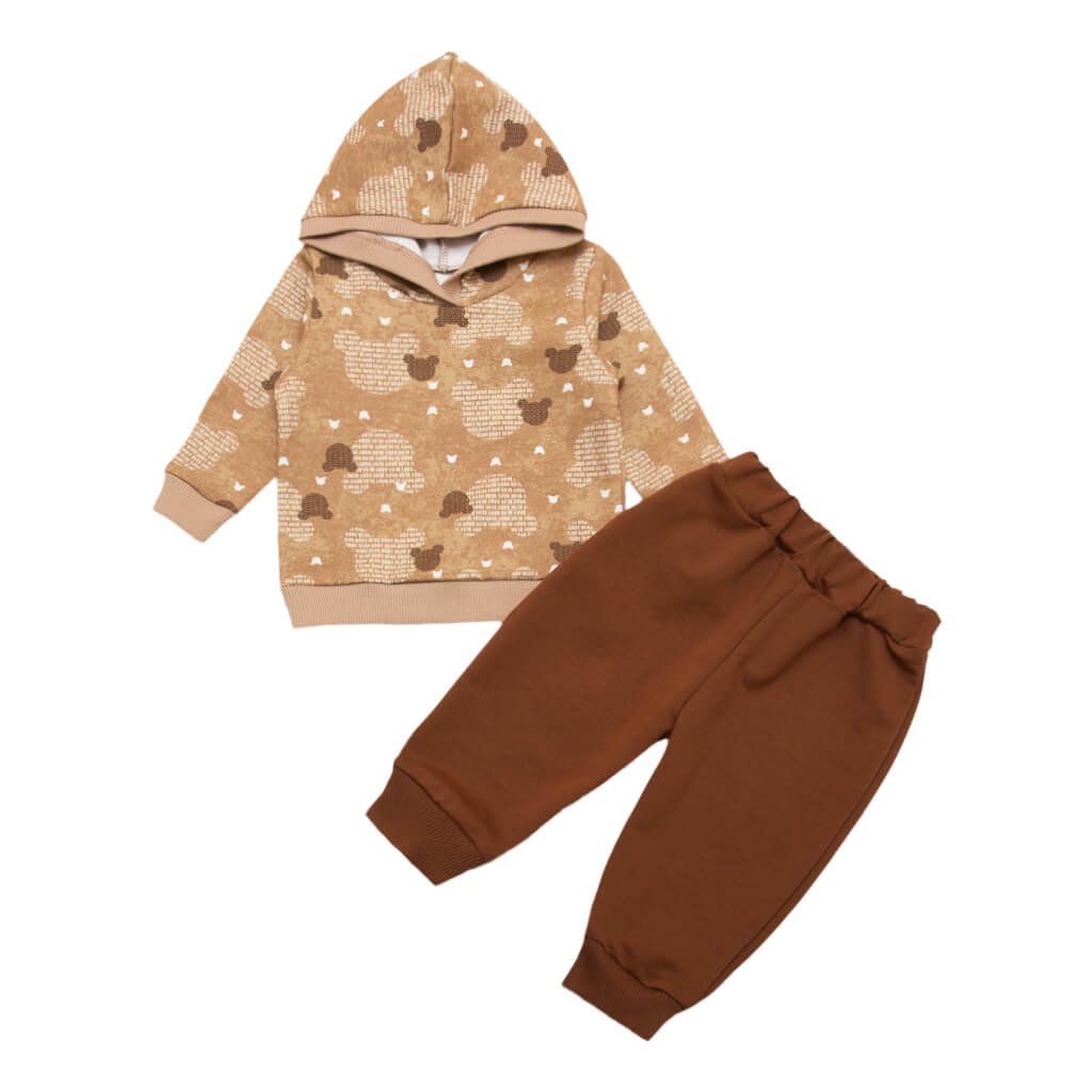 Теплі прогулянки та затишні домашні вечори стають ще приємнішими з зручним одягом. Комплект коричневого кольору з принтом ведмедиків з м'якої двонитки складається з кофти з капюшоном і комфортних штанців - практичне рішення для активних діточок. Капюшон захищає від вітряної погоди, а еластичні манжети по краях забезпечують надійну посадку і зберігають тепло. Штани забезпечують повну свободу рухів, тому дитині зручно грати та активно проводити час на прогулянках. В асортименті є варіанти кольорів для дівчаток і хлопчиків, що дозволяє легко підібрати відповідний стиль для кожного. Відмінний вибір для прохолодної погоди та стильного повсякденного образу.