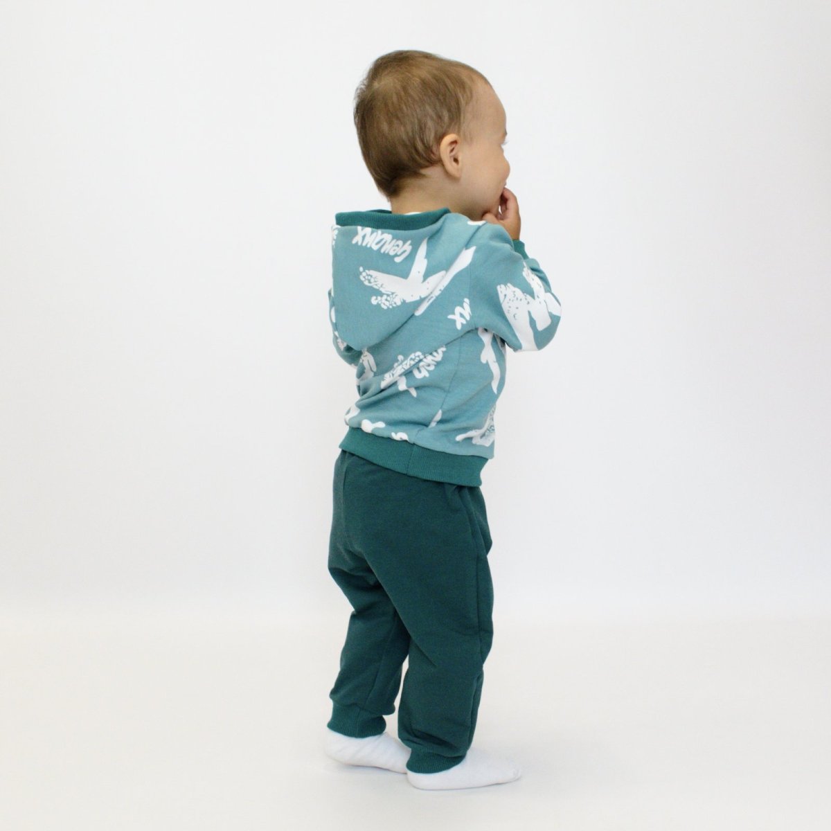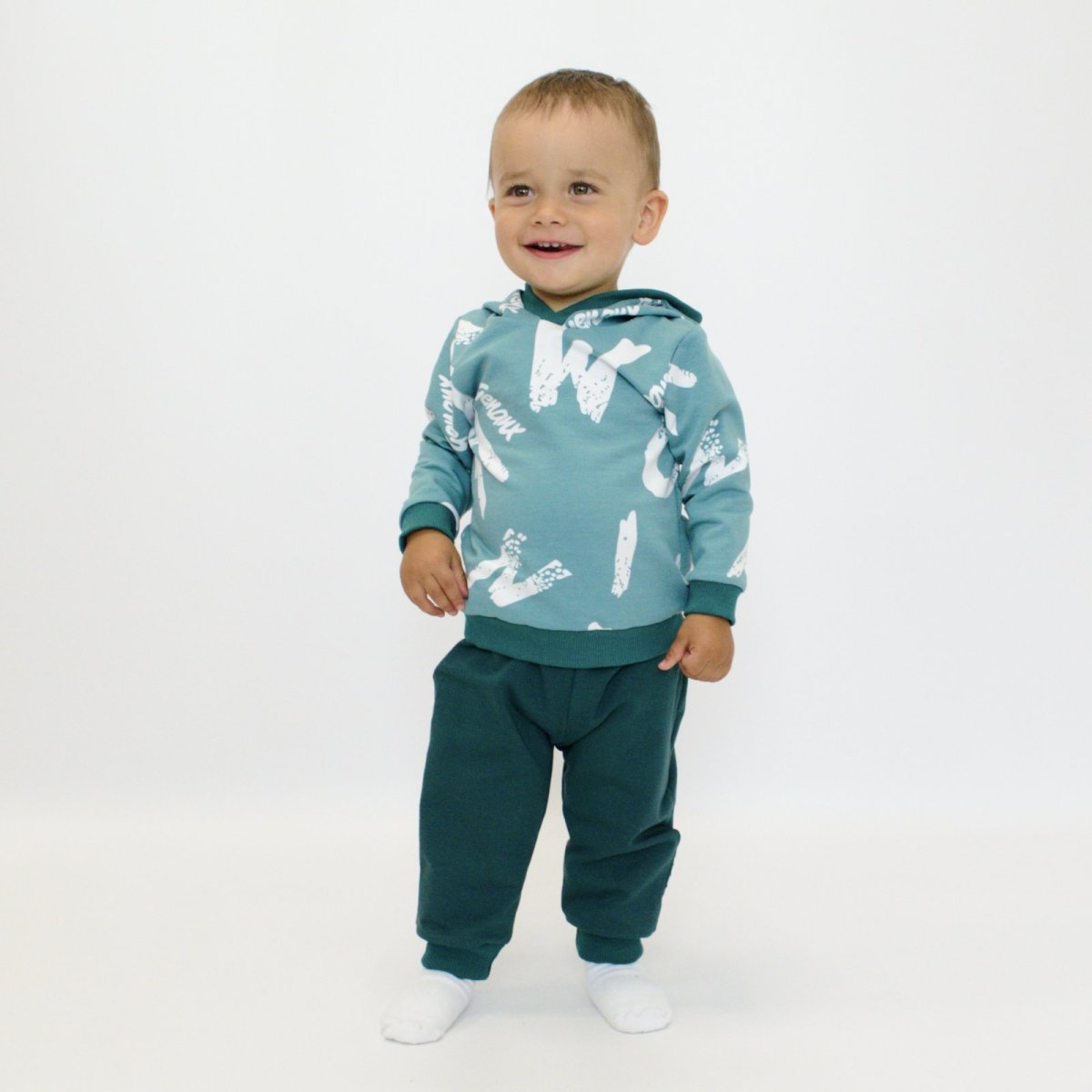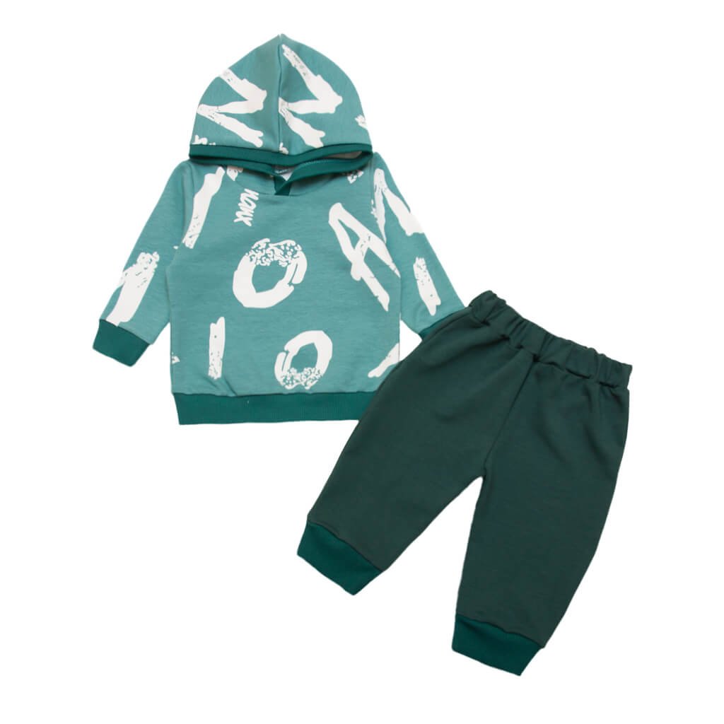 Теплі прогулянки та затишні домашні вечори стають ще приємнішими з зручним одягом. Комплект зеленого кольору з принтом букв з м'якої двонитки складається з кофти з капюшоном і комфортних штанців - практичне рішення для активних діточок. Капюшон захищає від вітряної погоди, а еластичні манжети по краях забезпечують надійну посадку і зберігають тепло. Штани забезпечують повну свободу рухів, тому дитині зручно грати та активно проводити час на прогулянках. В асортименті є варіанти кольорів для дівчаток і хлопчиків, що дозволяє легко підібрати відповідний стиль для кожного. Відмінний вибір для прохолодної погоди та стильного повсякденного образу.