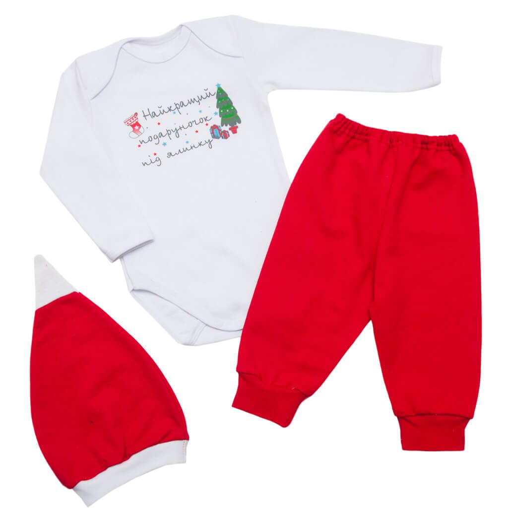 Гарний новорічний комплект для новонародженого хлопчика та новонародженої дівчинки – це чудовий варіант для святкового образу дитини. Вироби виготовлені із високоякісних натуральних бавовняних полотен. Білий боді з довгим рукавом з інтерлоку, приємний до тіла і м'який на дотик. Боді-човник з написом "Найкращий подарунок під ялинку", і доповненням до напису є новорічна ялинка, яка сподобається Вам і дитині! Штанці та шапочка з начісу, з утепленням. Штанці мають внизу манжети, резинка по поясу м'яка і дуже комфортна. Шапочка оригінальна по крою, доповнить образ. Швидше замовляйте костюм, і Ваша дитина буде готова до святкування!