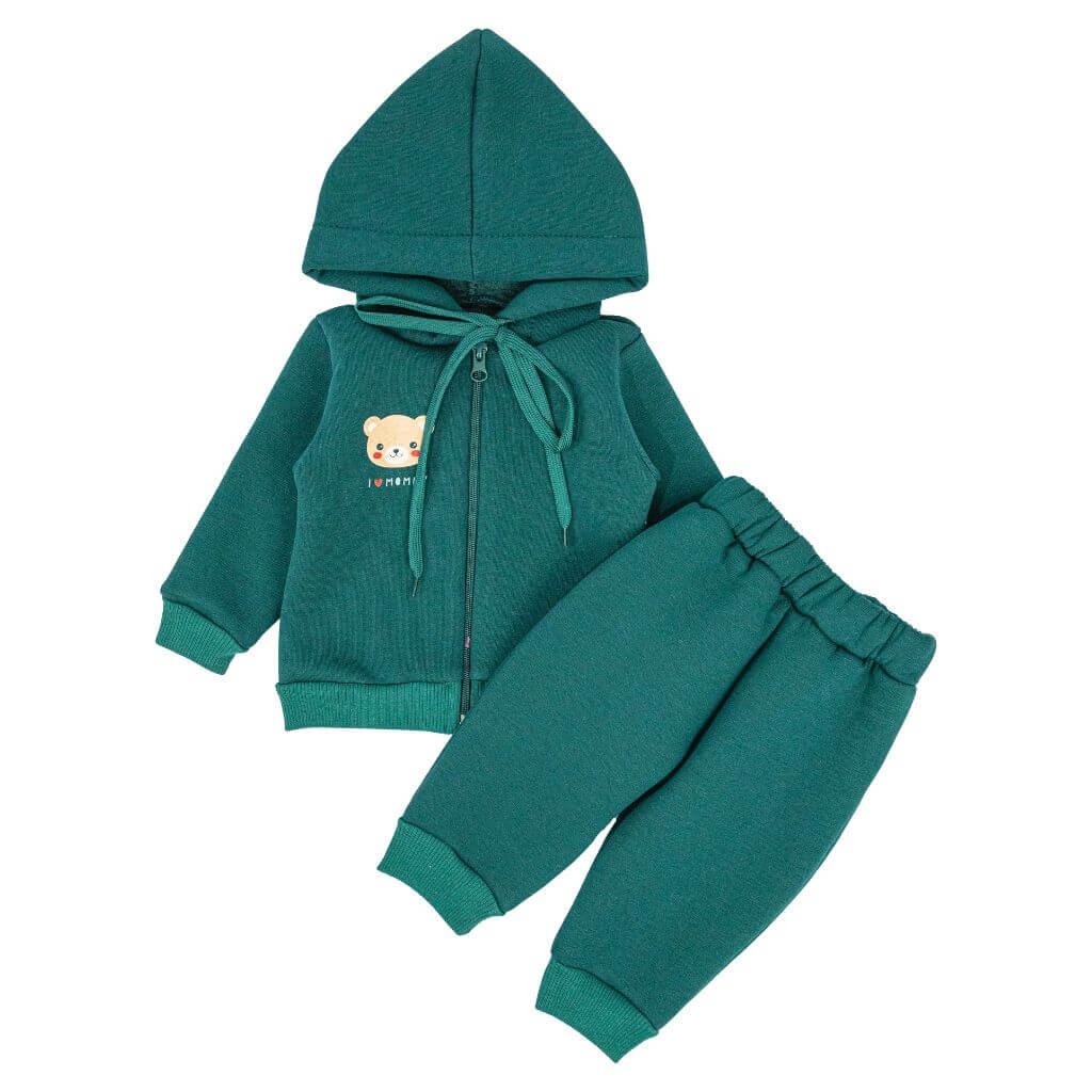 Дитячі комплекти кофтинок і штанців - зручний та багатофункціональний одяг, який потрібен абсолютно кожній дитині. Представлений смарагдовий комплект з малюнком ведмедика складається з кофти на блискавці та штанців. Всі вироби пошиті з якісного полотна - трьохнитки з начісним утепленням. Матеріал досить щільний і теплий, тому в такому костюмчику Вашому карапузові буде неймовірно комфортно. На кофті є невелике фарбування, а також присутній капюшон зі шнурочком. Штанці виконані на м'якій резинці. Будемо з нетерпінням чекати на Ваше замовлення в нашому інтернет-магазині!
