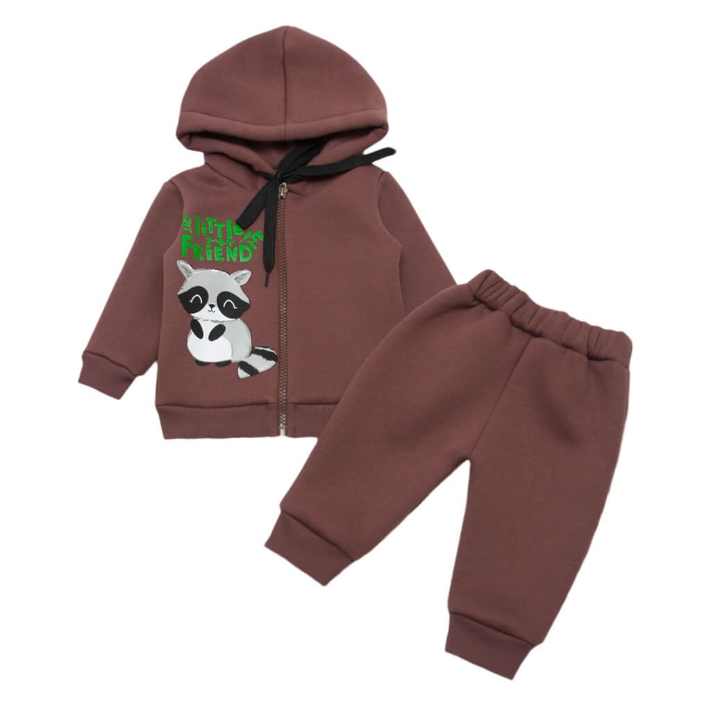 Дитячі комплекти кофтинок і штанців - зручний та багатофункціональний одяг, який потрібен абсолютно кожній дитині. Представлений комплект шоколадного кольору з малюнком єнота складається з кофти на блискавці та штанців. Всі вироби пошиті з якісного полотна - трьохнитки з начісним утепленням. Матеріал досить щільний і теплий, тому в такому костюмчику Вашому карапузові буде неймовірно комфортно. На кофті є невелике фарбування, а також присутній капюшон зі шнурочком. Штанці виконані на м'якій резинці. Будемо з нетерпінням чекати на Ваше замовлення в нашому інтернет-магазині!
