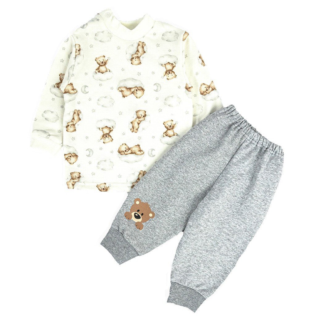 Дитячий комплект продуманий до дрібниць, щоб повсякденні образи малюка були не тільки милими, але і максимально зручними. Ніжна водолазка молочного кольору з принтом ведмедиків і зручні штанці сірого кольору ідеально підходять для повсякденного носіння вдома або на прогулянці. Полотно з начосом приємно торкається шкіри, добре зберігає тепло і підходить для прохолодної пори року, не перегріваючи дитину. Кофтинка виконана з акуратним малюнком. В області горловини передбачені кнопочки - вони помітно спрощують процес переодягання. Штани однотонні, доповнені акуратним принтом. Пояс на резинці забезпечує комфортну посадку і не заважає активним рухам.