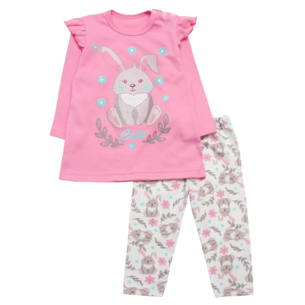 Неймовірно милий комплект для дівчинки обов'язково має поповнити гардероб Вашої маленької красуні. Представлена новинка складається з кофточки та штанців. Вироби пошиті із високоякісного інтерлоку, рожевого кольору принт зайчик. М'яке та приємне на дотик полотно забезпечить Вашому малюкові комфортне і приємне носіння. Кофточка пошита з однотонного полотна, плічка прикрашені милими крильцями, а на передній частині присутнє гарне фарбування. Біля горловини кофти є маленькі кнопочки. Штанці виготовлені з тканини з різними візерунками, які виконані в такому самому стилі, що і принт на кофтині.