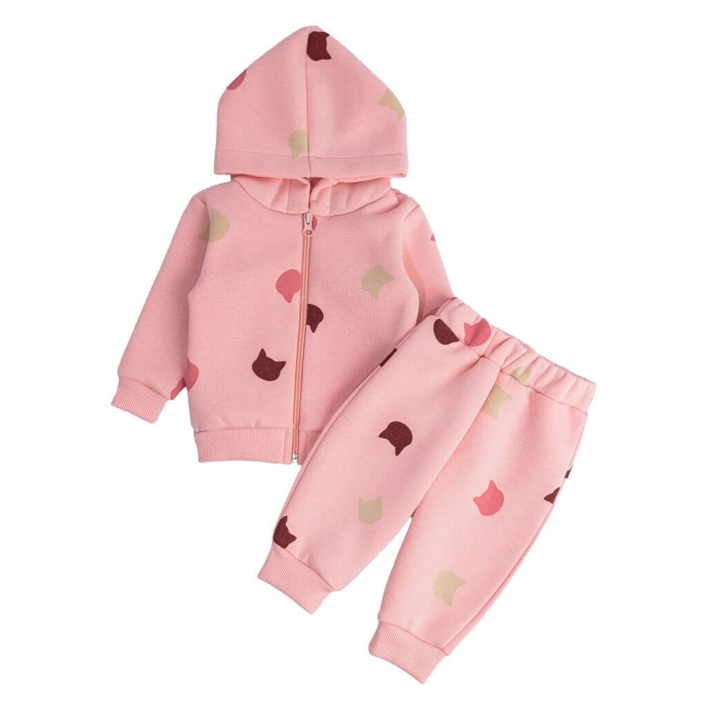Кофта на замку та штанці - ідеальна комбінація дитячого комплекту пудрового кольру з принтом котиків! Обидва вироби вільні по крою, пошиті з теплої трьохнитки. Малюку буде комфортно і дуже затишно в такому комплекті. Кофточка з капюшоном, на рукавах, по низу та краю капюшона оброблена стрейчем, який гармонійно підібраний до основного кольору полотна. Такий же стрейч присутній і внизу штанців. Дитячі штани на широкій, м'якій резинці, вона відмінно тягнеться і при правильному підборі розміру не тиснутиме на животик малюка. Кофтинку можна надіти поверх футболки або водолазки, які Ви також можете придбати у каталозі нашого інтернет-магазину!