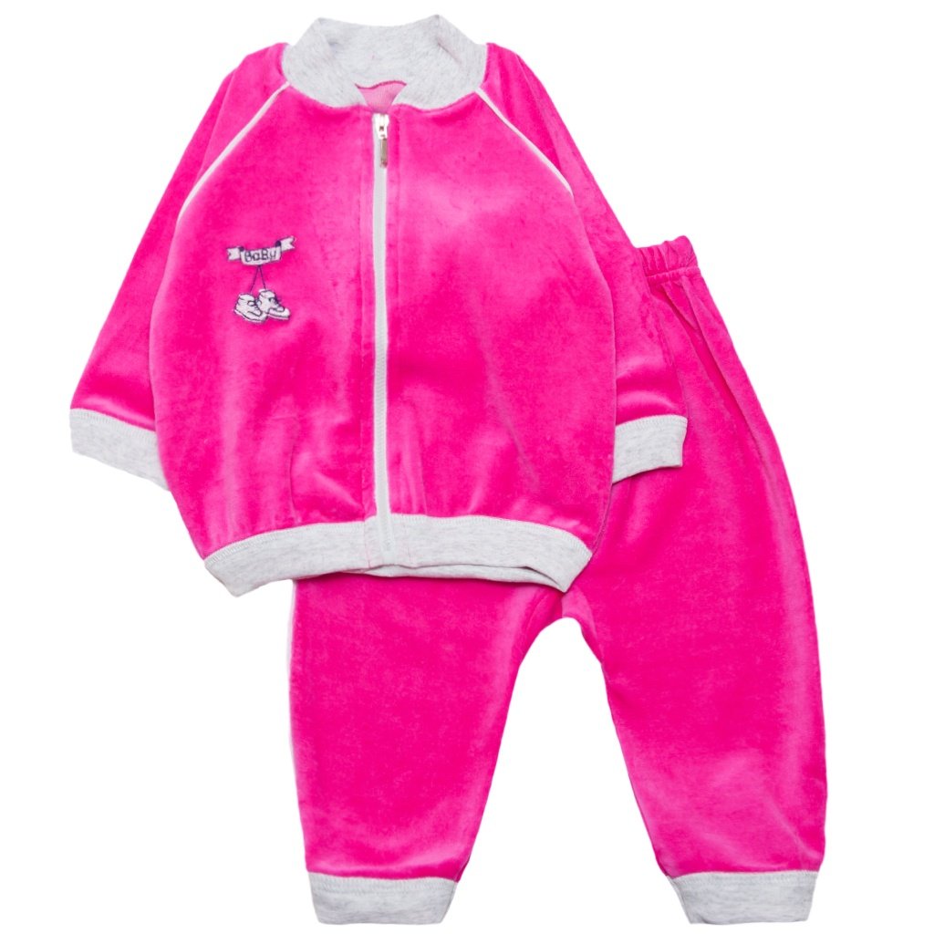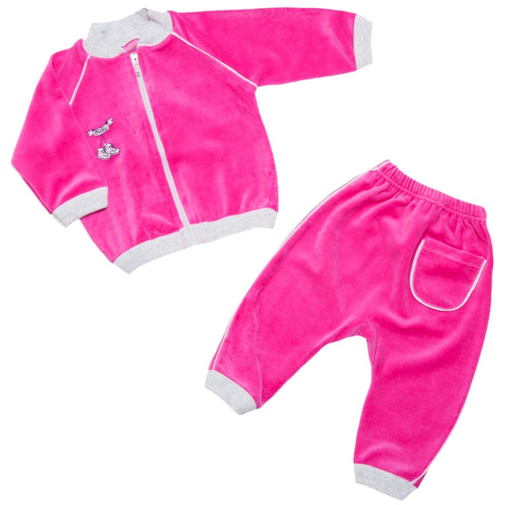 Новинка в ясельном розділі - спортивний костюм для дівчинки. Костюм виготовлений з якісного щільного полотна - велюр. Полотно тягнеться, добре сідає по фігурі, після прання не втрачає форму і колір. Також це полотно у носці не кошлатится, що дуже важливо для дитячого одягу. Костюм складається з кофтинки і штанців. Кофточка по переду на блискавці, рукав реглан, також є красива вишивка по переду. Штанці по поясу на резиночці, по низу на манжетах, по боках шви з кантом, а по заду на попі є не велика кишеня.