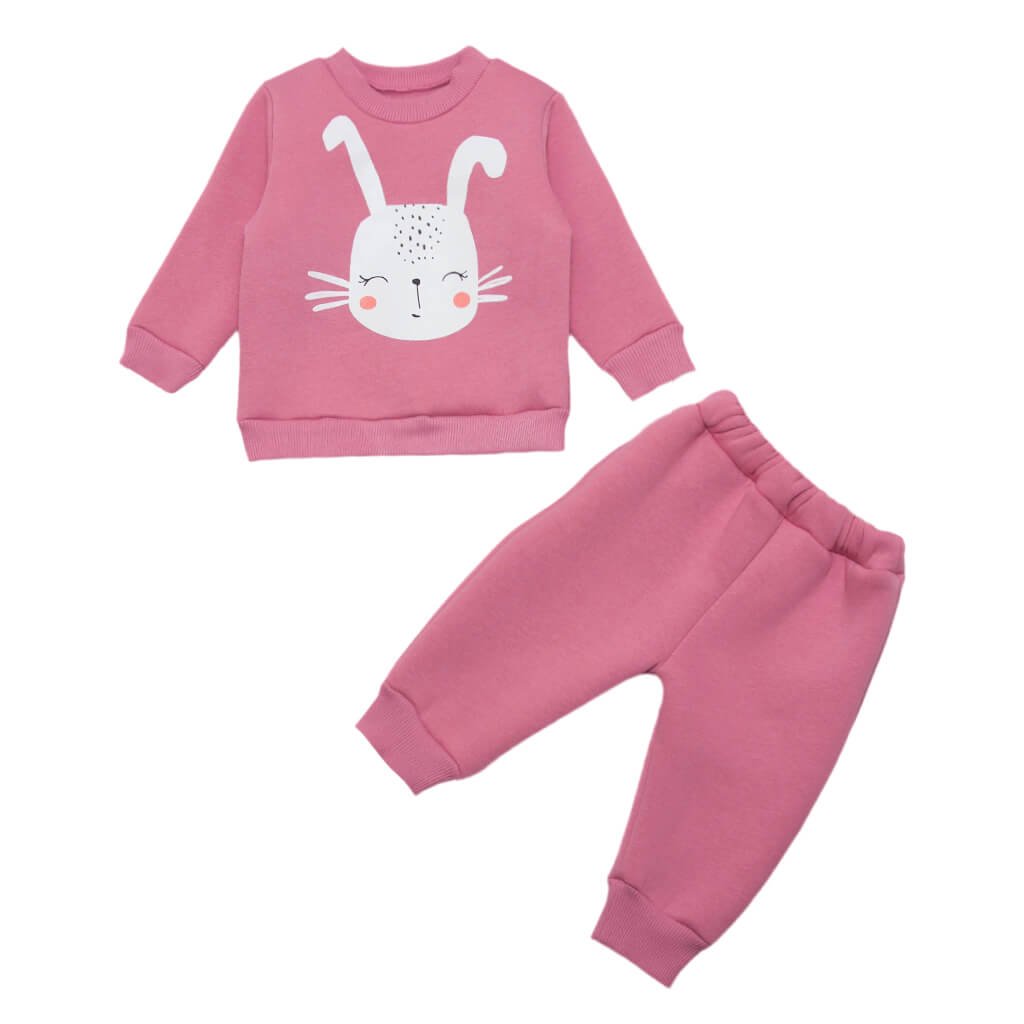 Створений для максимального комфорту і тепла, дитячий костюм рожевого кольору з принтом зайчика з полотна трьохнитка з начосом ідеально підійде для осені та зими. Завдяки щільному та ніжному на дотик матеріалу, костюм ефективно захищає дитину від холоду, забезпечуючи збереження тепла навіть у найхолоднішу погоду. У комплект входять джемпер і штанці, які гарантують свободу рухів і зручність у носінні. Джемпер прикрашений милим малюнком, який додає виробу стильного вигляду. Манжети на рукавах і по низу джемпера забезпечують щільне прилягання. Штанці виконані з еластичною резинкою на поясі, що дає змогу легко надягати їх і підлаштовувати під фігуру дитини.