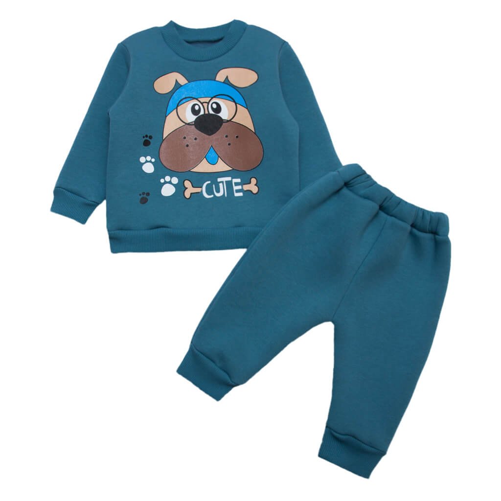 Створений для максимального комфорту і тепла, дитячий костюм темно-бірюзового кольору з принтом собачки з полотна трьохнитка з начосом ідеально підійде для осені та зими. Завдяки щільному та ніжному на дотик матеріалу, костюм ефективно захищає дитину від холоду, забезпечуючи збереження тепла навіть у найхолоднішу погоду. У комплект входять джемпер і штанці, які гарантують свободу рухів і зручність у носінні. Джемпер прикрашений милим малюнком, який додає виробу стильного вигляду. Манжети на рукавах і по низу джемпера забезпечують щільне прилягання. Штанці виконані з еластичною резинкою на поясі, що дає змогу легко надягати їх і підлаштовувати під фігуру дитини.