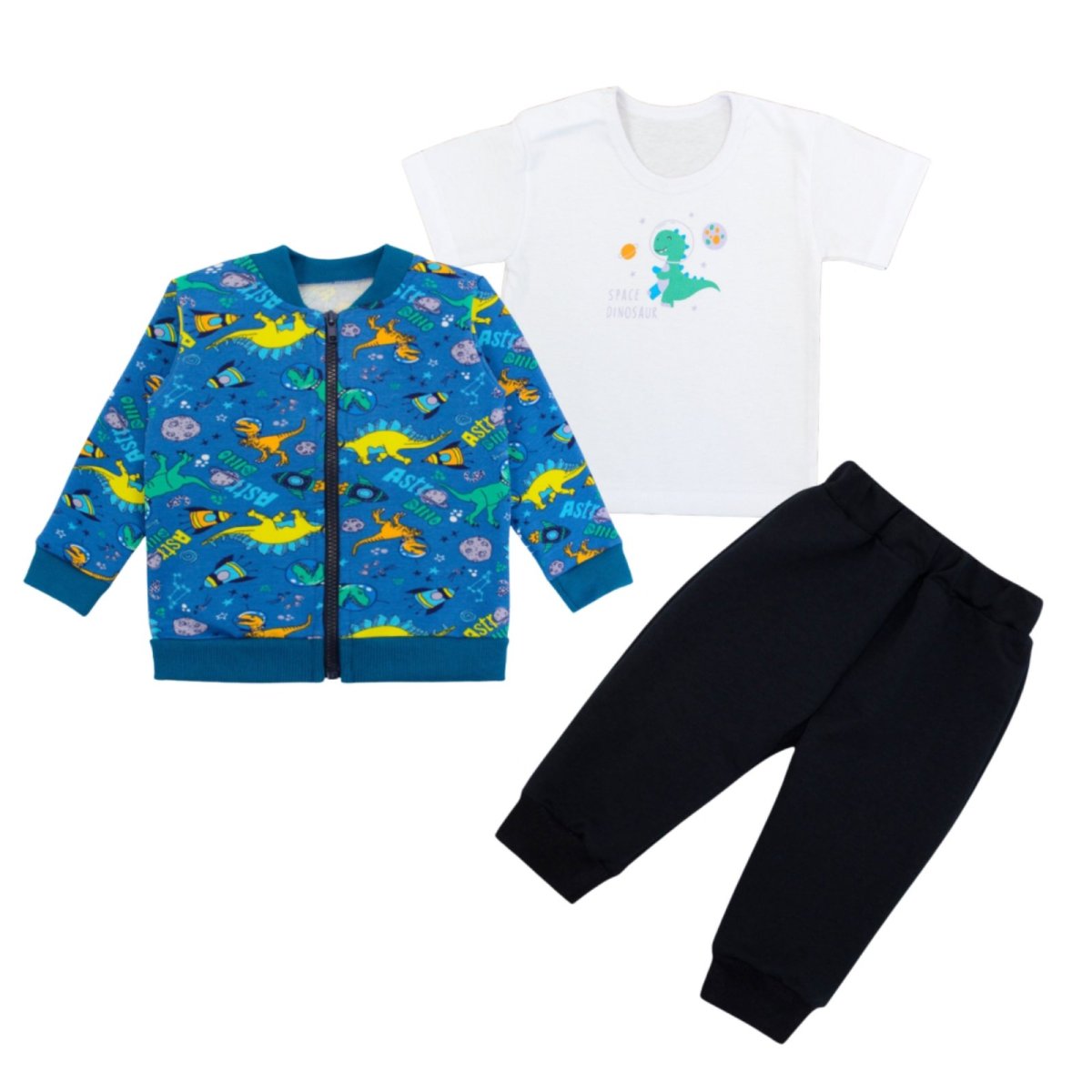 Кожен день малюка повинен бути сповнений комфорту та свободи рухів, і саме для цього створений цей комплект бірюзового кольору з принтом динозавриків. М'яка кофта з двонитки із застібкою-блискавкою відмінно захищає від вітру і легко одягається, а еластичні манжети по краях утримують тепло та забезпечують зручну посадку. Штани з того ж полотна м'яко облягають ніжки, не сковуючи активних ігор. Легка біла футболка з куліра прекрасно підходить для повсякденного носіння і поєднується з іншими речами гардеробу. У наявності представлені кольори для дівчаток і хлопчиків, що робить набір універсальним і стильним.