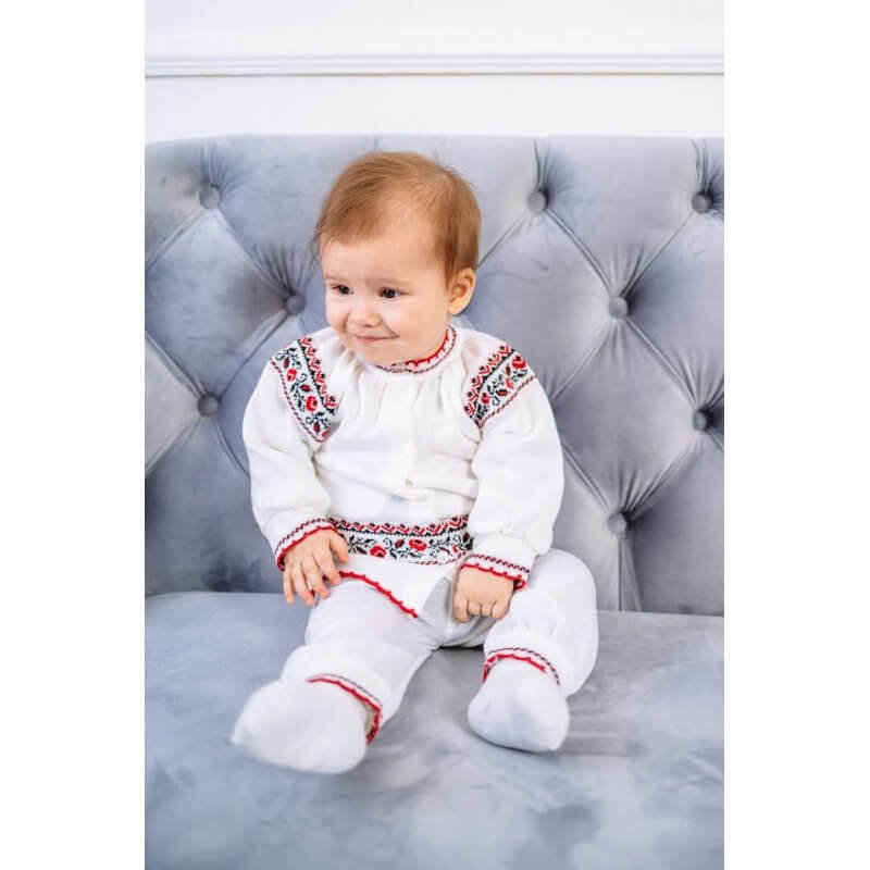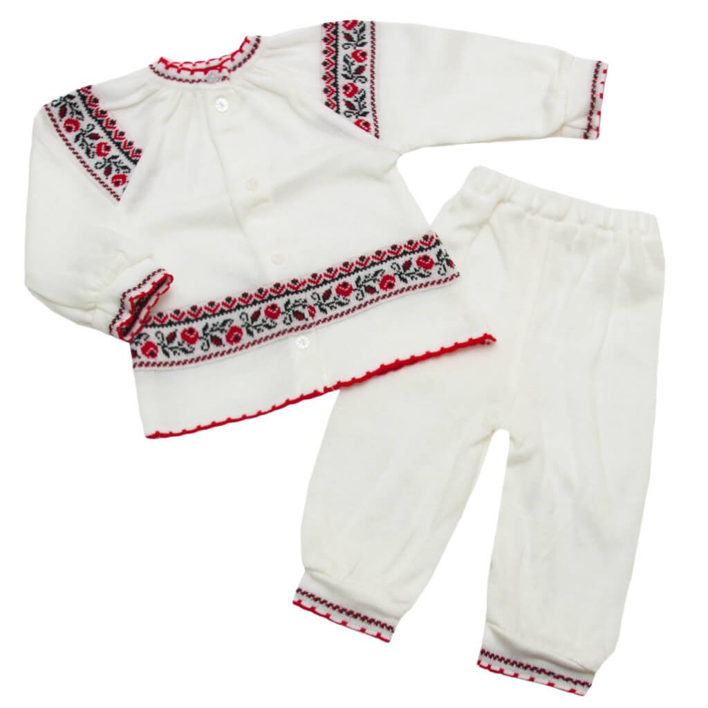 В'язаний дитячий комплект - ідеальний варіант на прохолодний сезон. Представлена модель комплекту складається з кофтинки та штанців. Кофта застібається на ґудзики. А штанці виконані на м'якій резиночці. Вироби виготовлені з якісної пряжі, у складі якої присутні вовна й акрил. Завдяки високій якості, такий комплект буде довго зберігати свій первісний стан після численних прань. Комплект має дуже красивий та ошатний вигляд, завдяки неймовірним елементам вишивки, якими прикрашена кофточка і низ штанців.