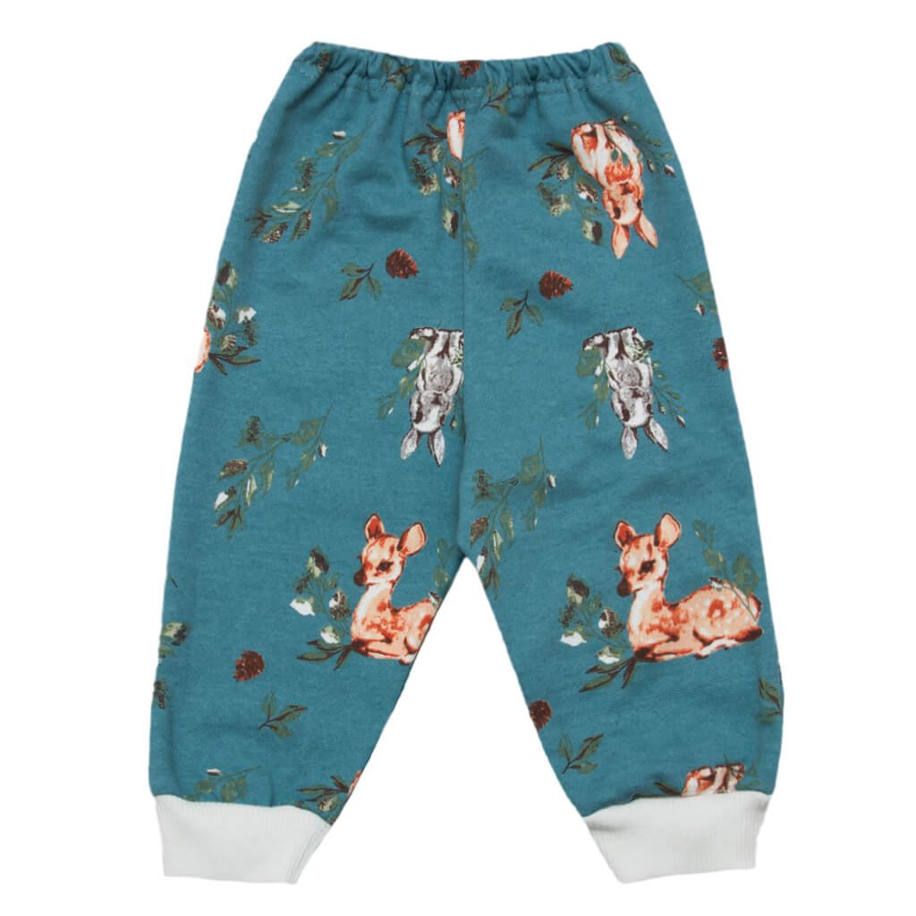 Дитячі штанці бірюзового кольору з принтом звіряток пошиті з якісного начісного полотна, яке складається на 100% з натуральної бавовни. Вони створені з урахуванням потреб малюків в осінньо-зимовий період, забезпечуючи тепло і комфорт у будь-яку погоду. М'яка тканина з начосом приємно прилягає до шкіри, зберігає тепло і захищає від протягів. Завдяки манжетам на ніжках штанці добре сидять і не задираються, що особливо важливо для активних дітей. Еластична гумка на поясі забезпечує надійну фіксацію, не створюючи тиску і незручності. По всій тканині розташовані милі малюнки, які надають виробу яскравості та стилю.