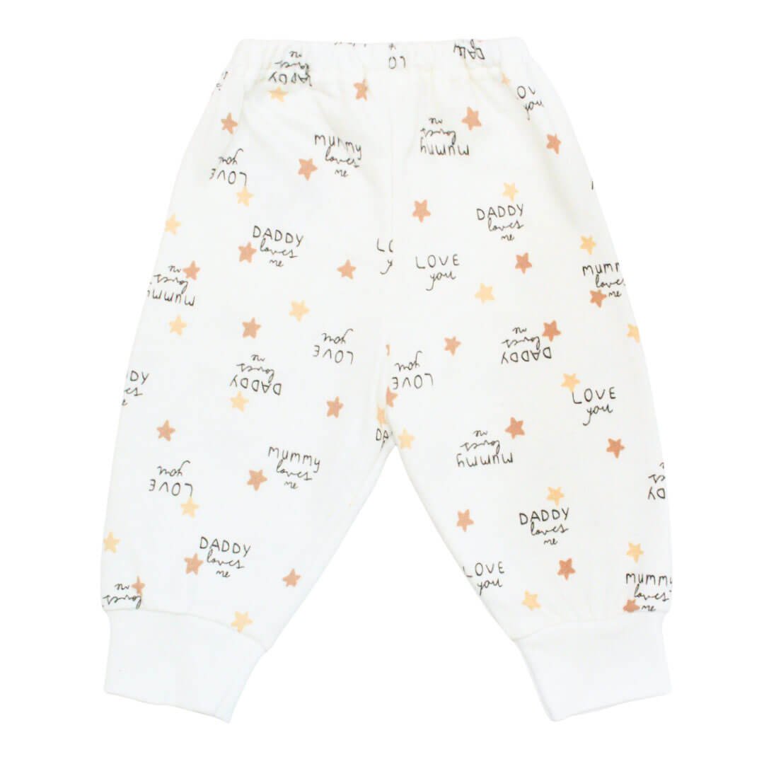 Дитячі штанці молочного кольору з принтом маленьких зірочок пошиті з якісного начісного полотна, яке складається на 100% з натуральної бавовни. Вони створені з урахуванням потреб малюків в осінньо-зимовий період, забезпечуючи тепло і комфорт у будь-яку погоду. М'яка тканина з начосом приємно прилягає до шкіри, зберігає тепло і захищає від протягів. Завдяки манжетам на ніжках штанці добре сидять і не задираються, що особливо важливо для активних дітей. Еластична гумка на поясі забезпечує надійну фіксацію, не створюючи тиску і незручності. По всій тканині розташовані милі малюнки, які надають виробу яскравості та стилю.