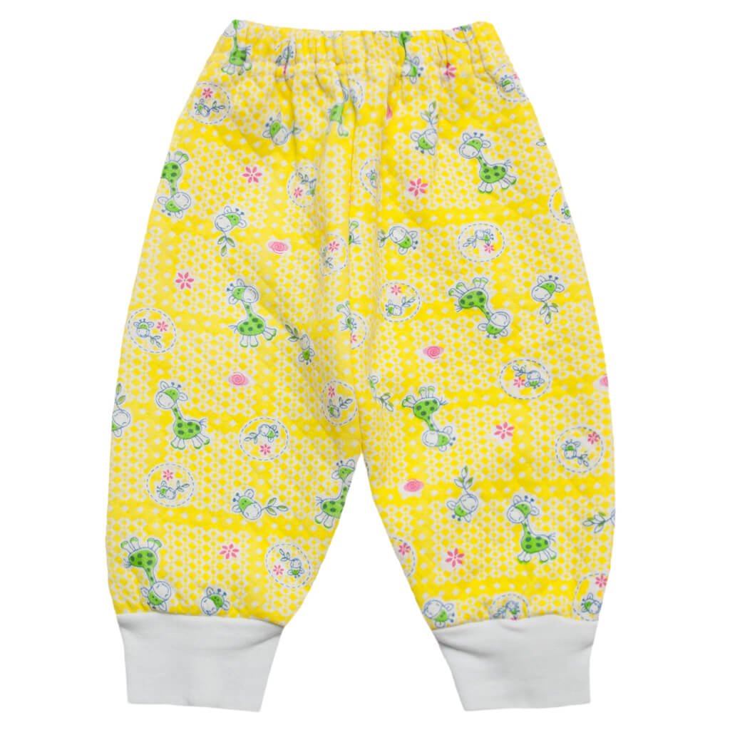 Дитячі штанці пошиті з високоякісного трикотажного полотна - капітону. Завдяки тому, що тканина повністю складається з натуральної бавовни, вироби з цього матеріалу вирізняються неймовірною гладкістю і практично не мнуться. Також полотно капітон дуже м'яке і приємне на дотик, що відмінно підходить для дитячого одягу. Представлена модель штанців для малюків виконана вільного крою, на поясі присутня резинка, а краї виробу оброблені манжетами. По всьому полотну присутні милі малюнки, які прекрасно доповнюють дизайн штанців.