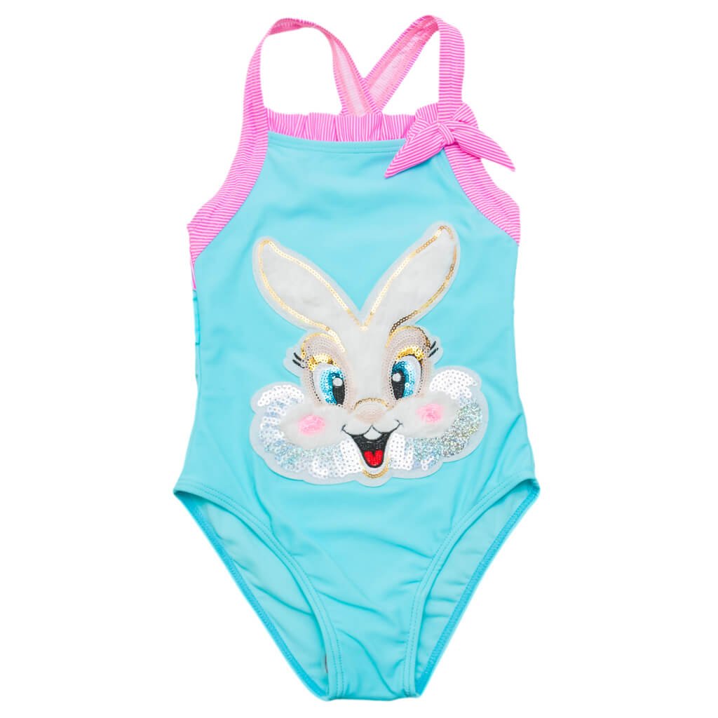 Ще одна прекрасна моделька суцільного купальника, яскравий, бірюзовий купальник обов'язково сподобатися Вашій малюткі. Верх купальника розбавлений рожевою обшивкою, завдяки бретелям, що на спинці сходяться хрест на хрест дівчинці буде дуже зручно так як вони не будуть спадати з плечиків. Спереду купальника по середині є не менше красива і яскрава аплікація з паєток "Кролик", верх купальника прикрашає маленький бантик. Купальник виготовлений з еластичного полотна яке добре тягнеться, а також добре пропускає повітря.