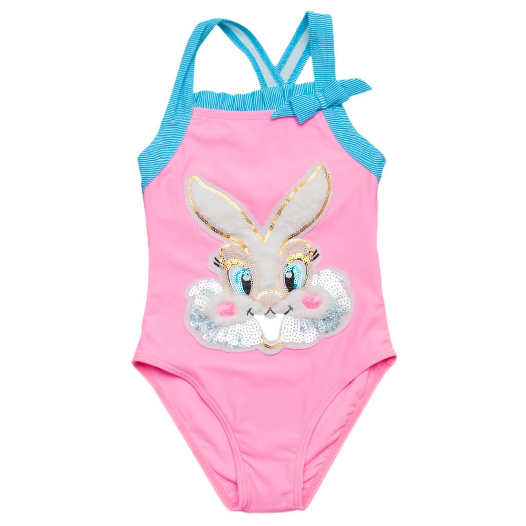 Ще одна прекрасна моделька суцільного купальника, яскравий, рожевий купальник обов'язково сподобатися Вашій малюткі. Верх купальника розбавлений рожевою обшивкою, завдяки бретелям, що на спинці сходяться хрест на хрест дівчинці буде дуже зручно так як вони не будуть спадати з плечиків. Спереду купальника по середині є не менше красива і яскрава аплікація з паєток "Кролик", верх купальника прикрашає маленький бантик. Купальник виготовлений з еластичного полотна яке добре тягнеться, а також добре пропускає повітря.