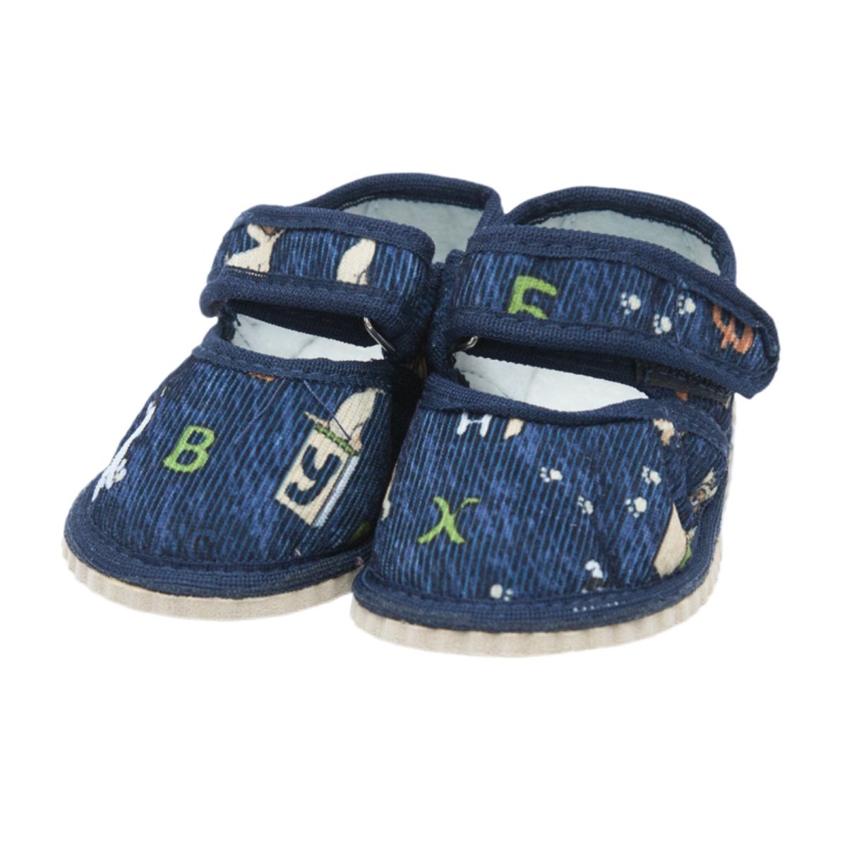 Закриті дитячі капці ідеальний варіант як для прогулянок, так і використання як змінне взуття. Дана модель легка і зручна. Підошва, гнучка і не слизька, спереду підошва так само злегка завищена, що забезпечує додатковий захист носка: як дитину - від травмування, так і самого взуття - від протирання. Капці для хлопчика з липучками, завдяки яким малюка можна привчати до самостійного перевзування. Взуття темно-синього кольору з принтом букв. Завдяки закритій п'ятці і липучкам, ніжка малюка буде добре зафіксована, і йому буде комфортно.