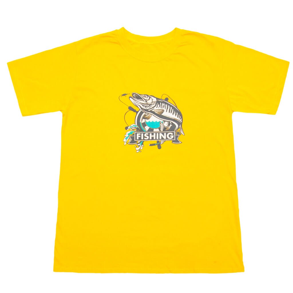Інтернет-магазин торгової марки «Арлекин» готовий представити Вашій увазі нові моделі футболок для дорослих. Футболки – невід'ємна частина гардеробу абсолютно кожної людини. Дана чоловіча футболка пошита з трикотажного бавовняного матеріалу – куліра жовтого кольору. Натуральне полотно гарантує максимальний комфорт та зручність при носінні. На лицьовій частині виробу є яскраве фарбування, яке обов'язково сподобається любителям рибальства. Таку футболку можна легко комбінувати з будь-якими шортами, штанами або джинсами.