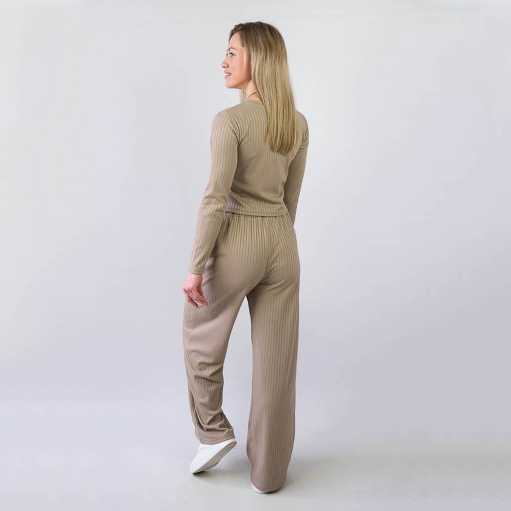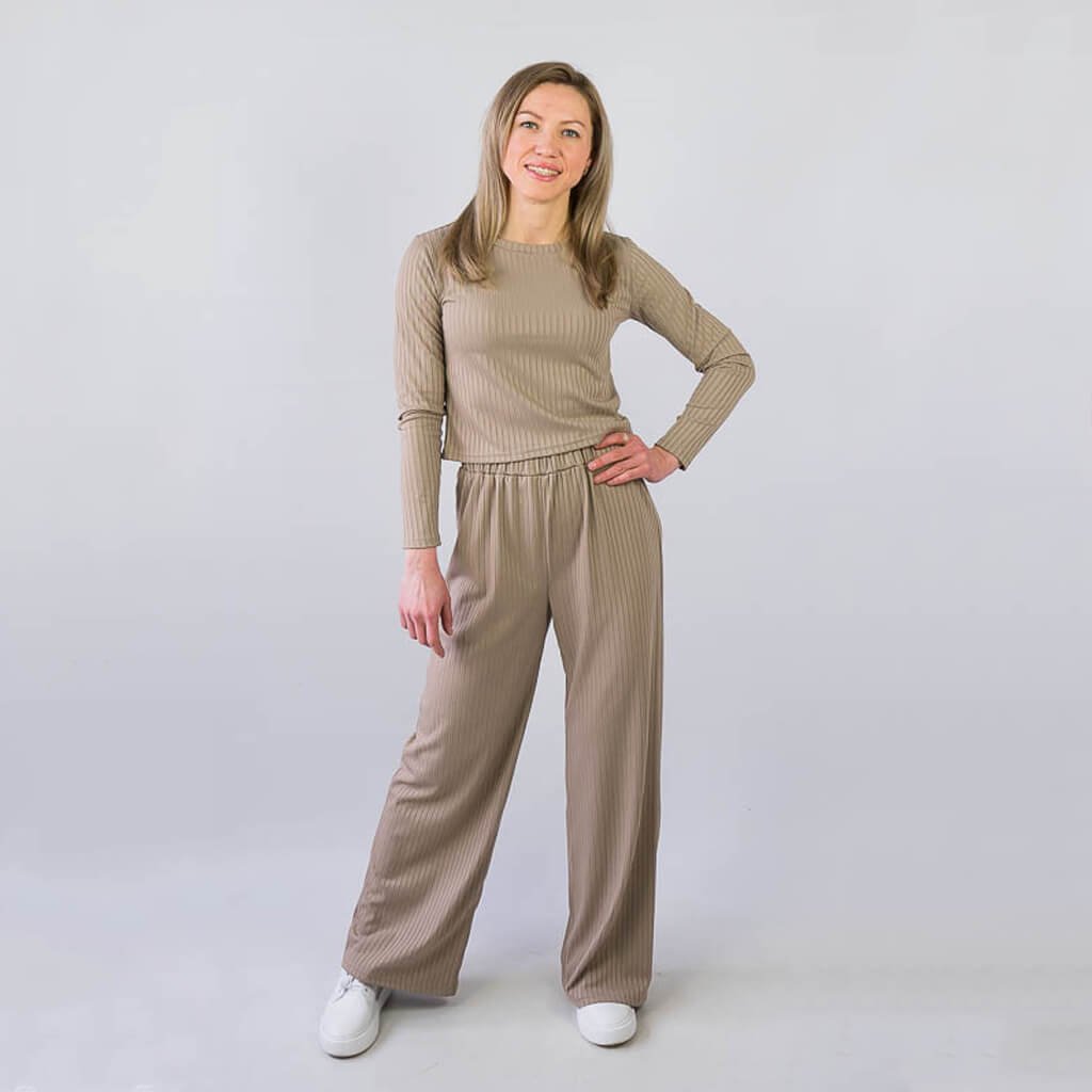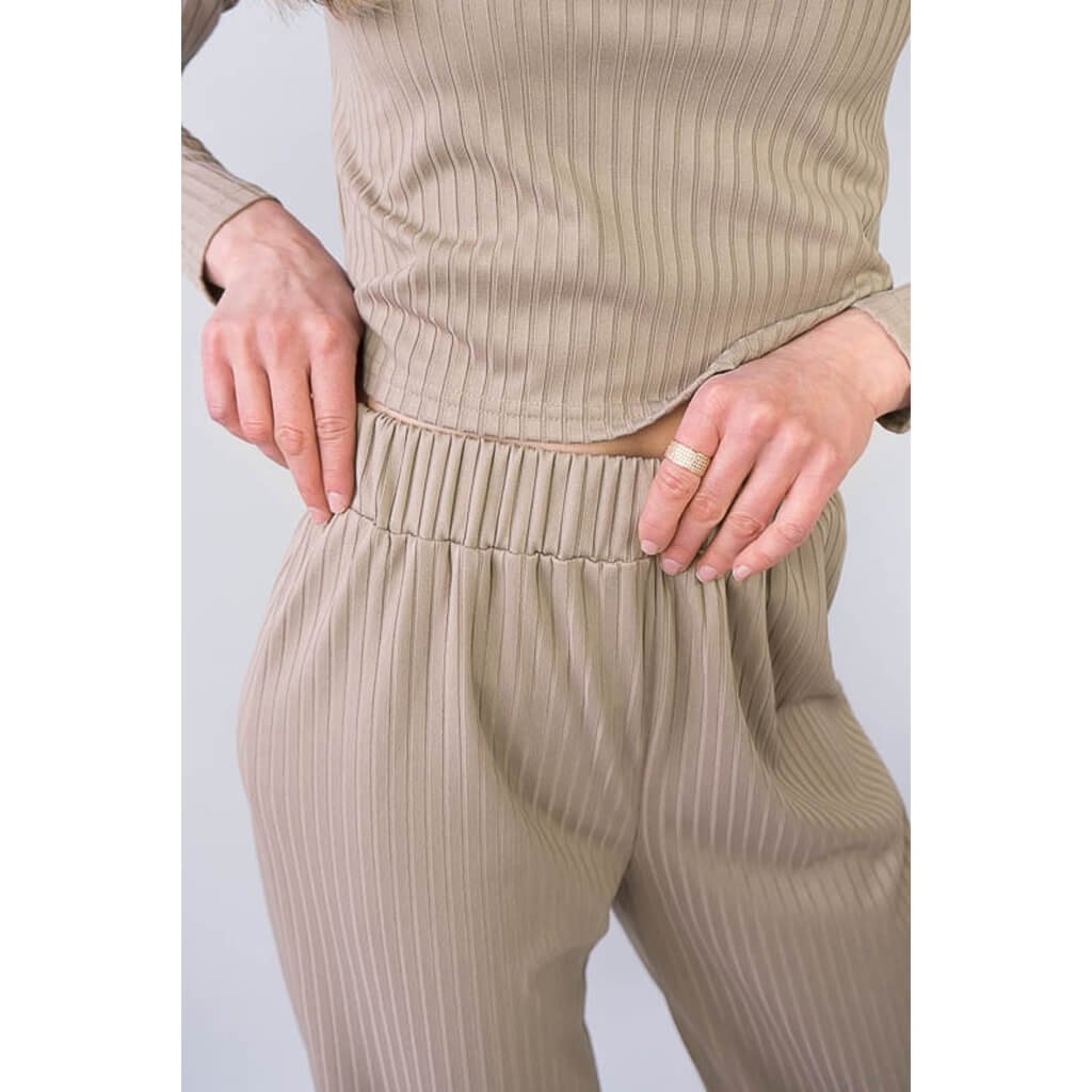 Нова модель жіночого костюма бежевого кольору виготовлена з високоякісного полотна мустанг. Костюм складається з двох виробів: укороченого лонгсліва та широких прямих штанів. Полотно добре пропускає повітря, що робить комплект ідеальним для носіння в будь-яку пору року. Представлений комплект дуже універсальний, адже вироби ідеально поєднуються між собою, і при цьому їх можна з легкістю комбінувати з іншим одягом. Костюм доступний до замовлення в декількох приємних однотонних кольорах, завдяки чому Ви точно знайдете ідеальний варіант для себе.