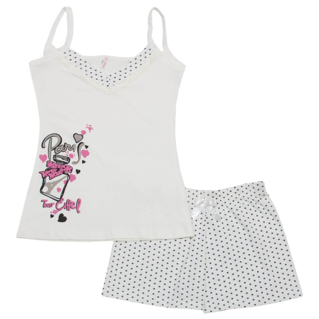 Жіноча піжама складається з майки на тонких бретельках та шортиків. Представлені вироби пошиті із високоякісного трикотажного полотна – стрейч-куліра. Матеріал відмінно тягнеться і добре тримає свою форму. Дана модель жіночої піжами неймовірно зручна і при цьому дуже красива. Однотонна майка прикрашена стильним фарбуванням на передній стороні. А шортики з тканини в горошок доповнює милий бантик. Також на поясі шорт є м'яка резинка. Такий піжамний комплект стане ідеальним варіантом на теплий сезон.