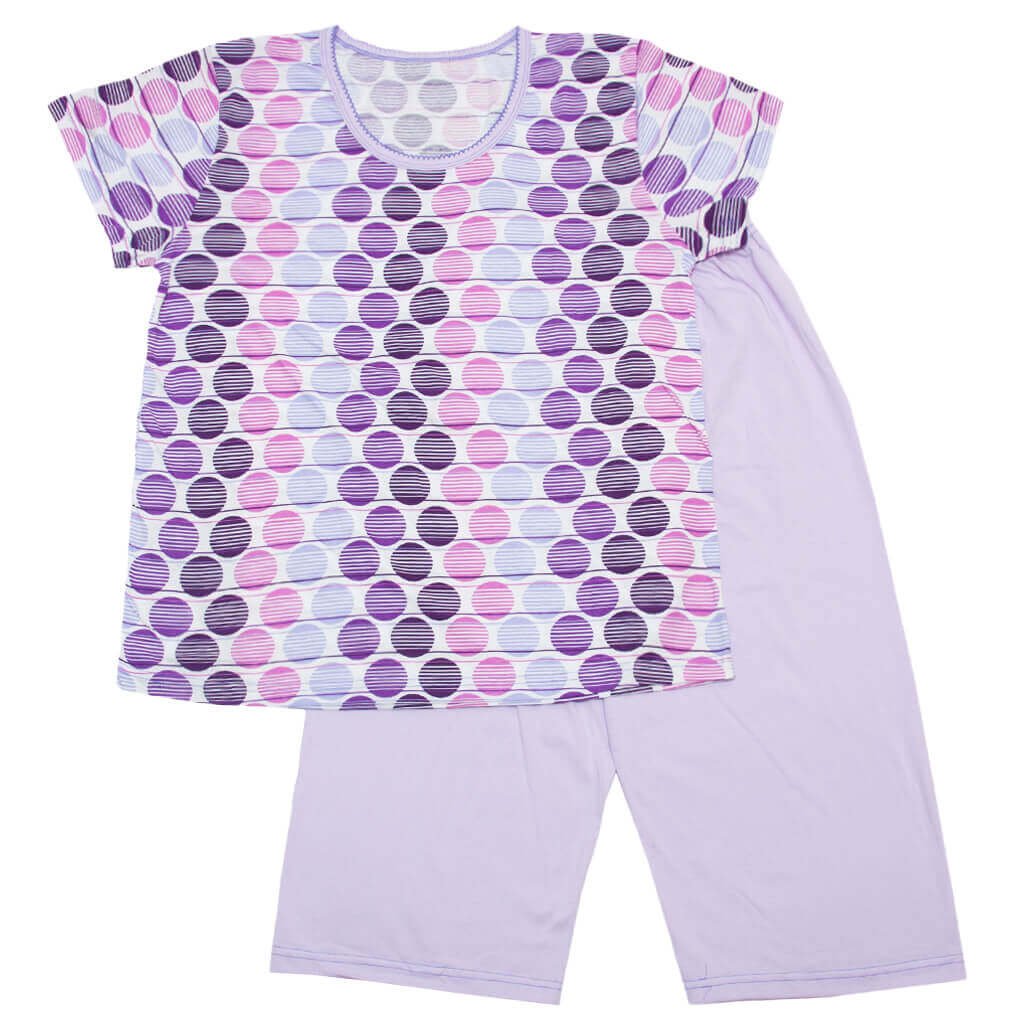 Наш інтернет-магазин ТМ Арлекин поповнив свій асортимент жіночого одягу кількома піжамними комплектами. Піжама - одяг, який призначений для сну, тому має бути зручним і приємним. Представлена модель пошита з якісного та натурального полотна – куліра. У комплект входить футболочка вільного крою та бузкові штанці. Футболка виготовлена із полотна з різними візерунками, а штани із однотонної тканини. Такий піжамний комплект гарантує Вам максимальний комфорт та затишок. Швидше оформляйте замовлення на нашому сайті! Приємних покупок.