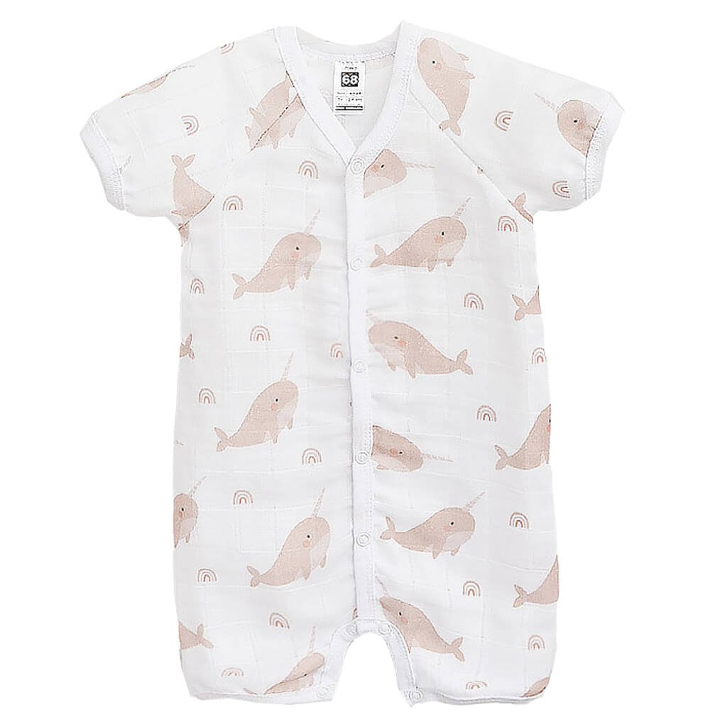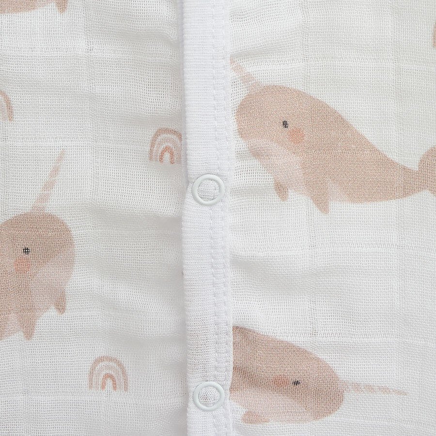 Пісочник - ідеальний варіант дитячого комбінезона на теплу пору року. Вашій увазі представлений новий дитячий пісочник молочного кольору з малюнками нарвалів, який пошитий з високоякісного полотна - мусліну. Такий матеріал досить легкий та дуже приємний на дотик, завдяки чому виріб забезпечує ніжний контакт зі шкірою дитини та дає їй змогу вільно рухатися. Також, полотно муслін легко переться і швидко сохне. Пісочник доповнений зручними кнопками, розташованими по всій довжині, що полегшує його надягання та зняття, а також гарантує відмінну посадку.