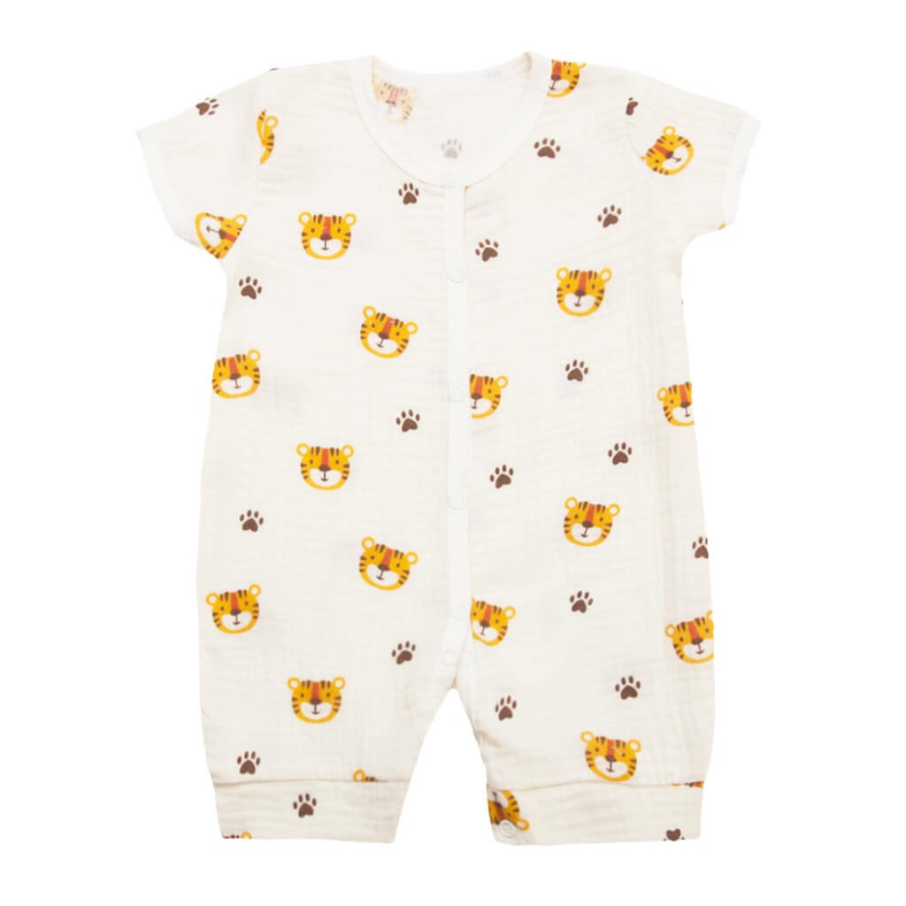 Представлена модель дитячого комбінезона кремового кольору з принтом тигреня виконана з високоякісного полотна - мусліну, який м'яко прилягає до шкіри малюка, не викликаючи подразнення. Легка, приємна на дотик тканина забезпечує циркуляцію повітря, допомагаючи уникнути перегріву навіть у спекотні дні. Комбінезон має зручний крій з коротким рукавом, який не сковує рухів, дозволяючи дитині активно пізнавати світ. Повністю розстібається передня частина на кнопках, що робить процес одягання і переодягання максимально швидким і простим. Ніжний принт робить комбінезон стильним вибором для прогулянок, сну або ігор.