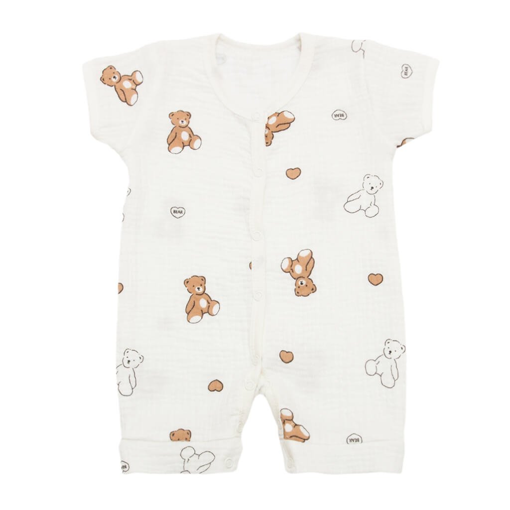 Представлена модель дитячого комбінезона молочного кольору з принтом ведмедиків виконана з високоякісного полотна - мусліну, який м'яко прилягає до шкіри малюка, не викликаючи подразнення. Легка, приємна на дотик тканина забезпечує циркуляцію повітря, допомагаючи уникнути перегріву навіть у спекотні дні. Комбінезон має зручний крій з коротким рукавом, який не сковує рухів, дозволяючи дитині активно пізнавати світ. Повністю розстібається передня частина на кнопках, що робить процес одягання і переодягання максимально швидким і простим. Ніжний принт робить комбінезон стильним вибором для прогулянок, сну або ігор.